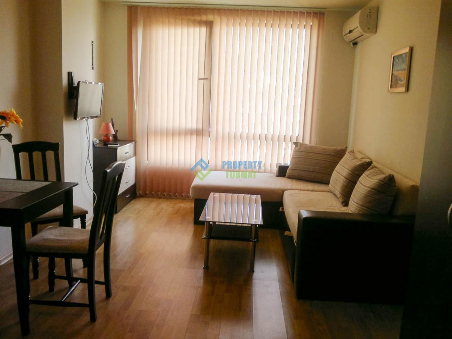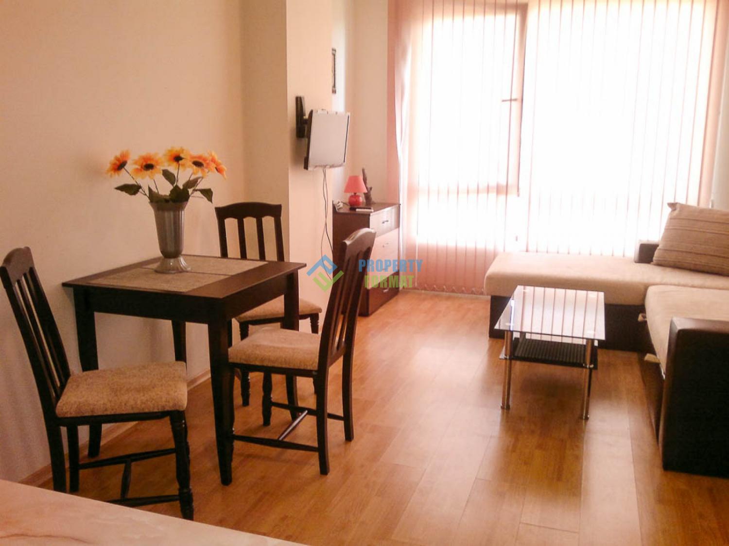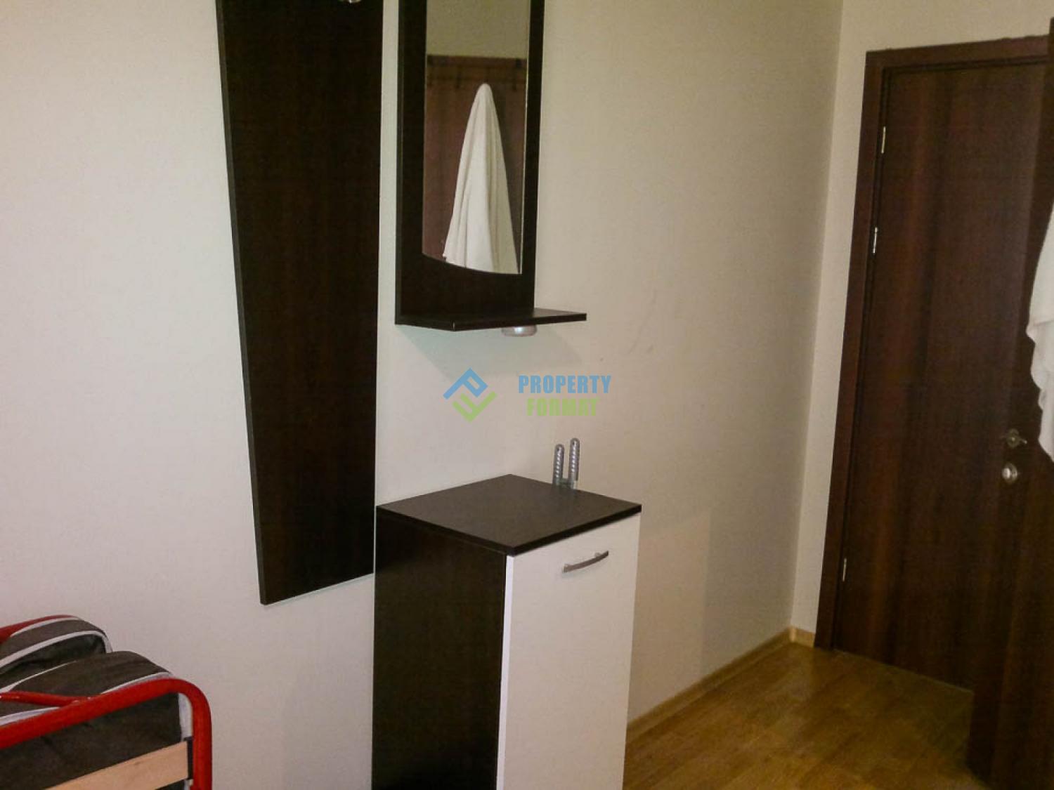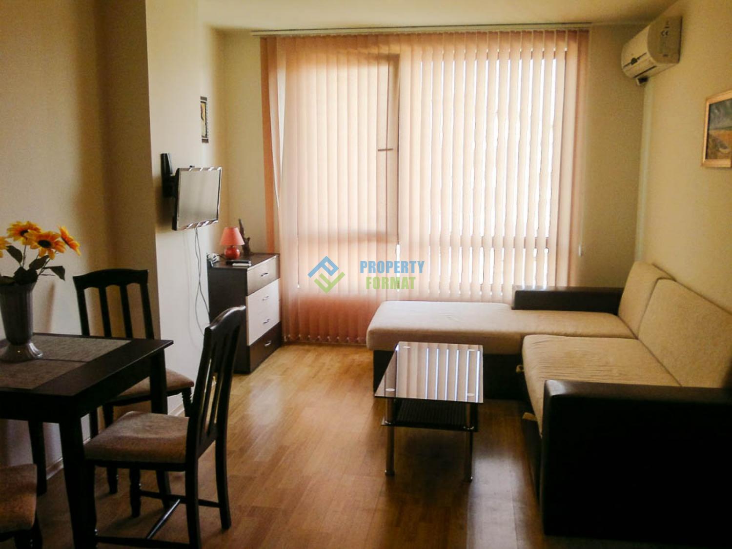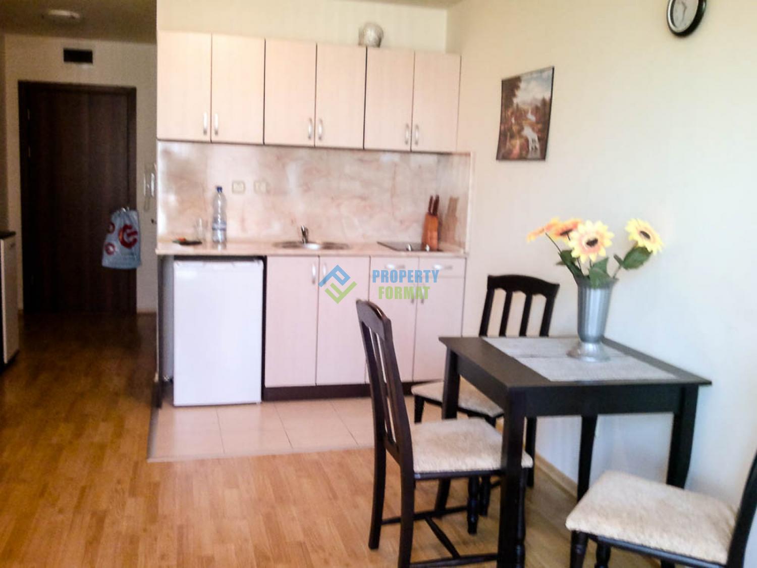 Уютная студия удобно разграничена на две зоны – для отдыха и кухонную часть. Апартамент обставлен необходимой мебелью, установлен кондиционер и телевизор. С балкона видно прекрасную территорию комплекса и окрестности города.
