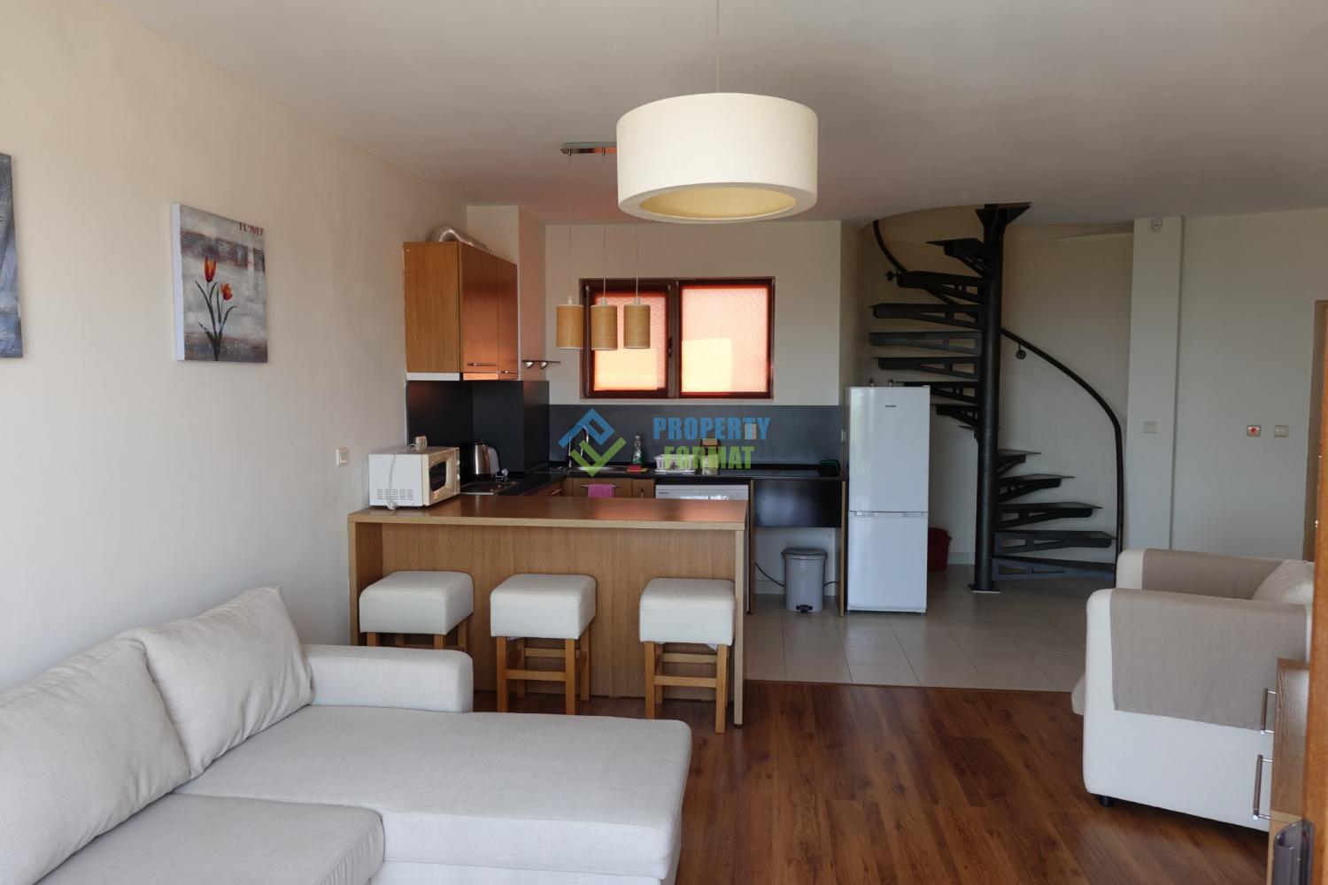 В меблированных двухярусных апартаментах есть гостиная и кухонная зона, спальня, ванная комната с душем и терраса с видом на море.