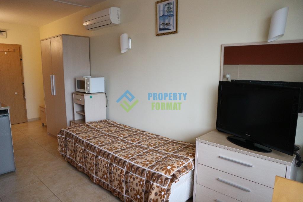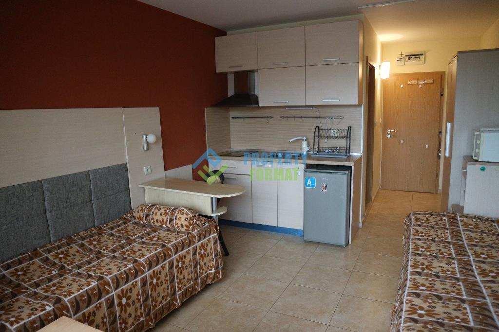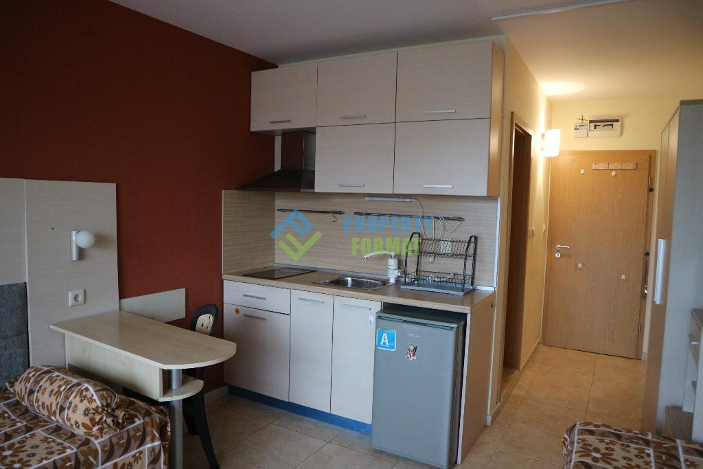 Разположението на апартамента се състои от дневна с кухненски бокс и баня с душ кабина. Апартаментът е напълно обзаведен и готов за вашето настаняване.