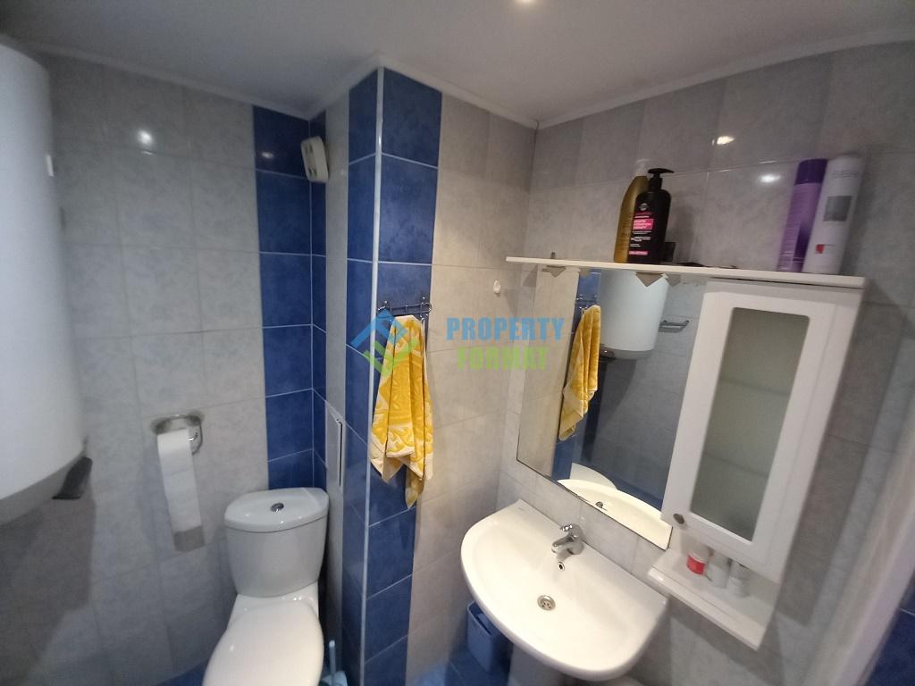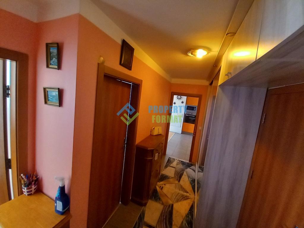 Апартаментът се намира на 4-ти етаж, чиято площ е 85 кв.м., състои се от коридор с вградени гардероби, две спални, всекидневна с трапезария, баня и балкон, където в горещ ден можете да седнете на просторен диван с чаша студено вино. Жилището е с локално парно, камина с водна риза и се продава напълно оборудвано с мебели и уреди, както и подземен паркинг за 17 000 евро. Има минимално заплащане за асансьор и почистване на входа в размер на 120 лв. на година. Това е отличен вариант за постоянно живеене..