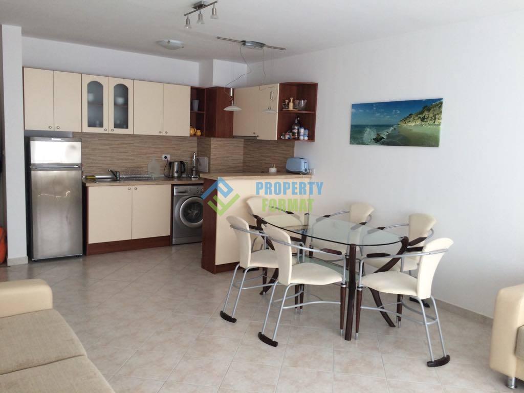 Приятен и светъл апартамент с площ 66 кв.м. и се състои от антре, просторна всекидневна с кухненски бокс, спалня, баня с тоалетна и тераса с прекрасна гледка към морето. Апартаментът е напълно обзаведен, кухненски кът оборудван с вградени уреди, от всяка стая е предвиден изход към терасата. Прекрасна възможност за закупуване на недвижими имоти в екологично чист район, най-благоприятна за почивка и престой.