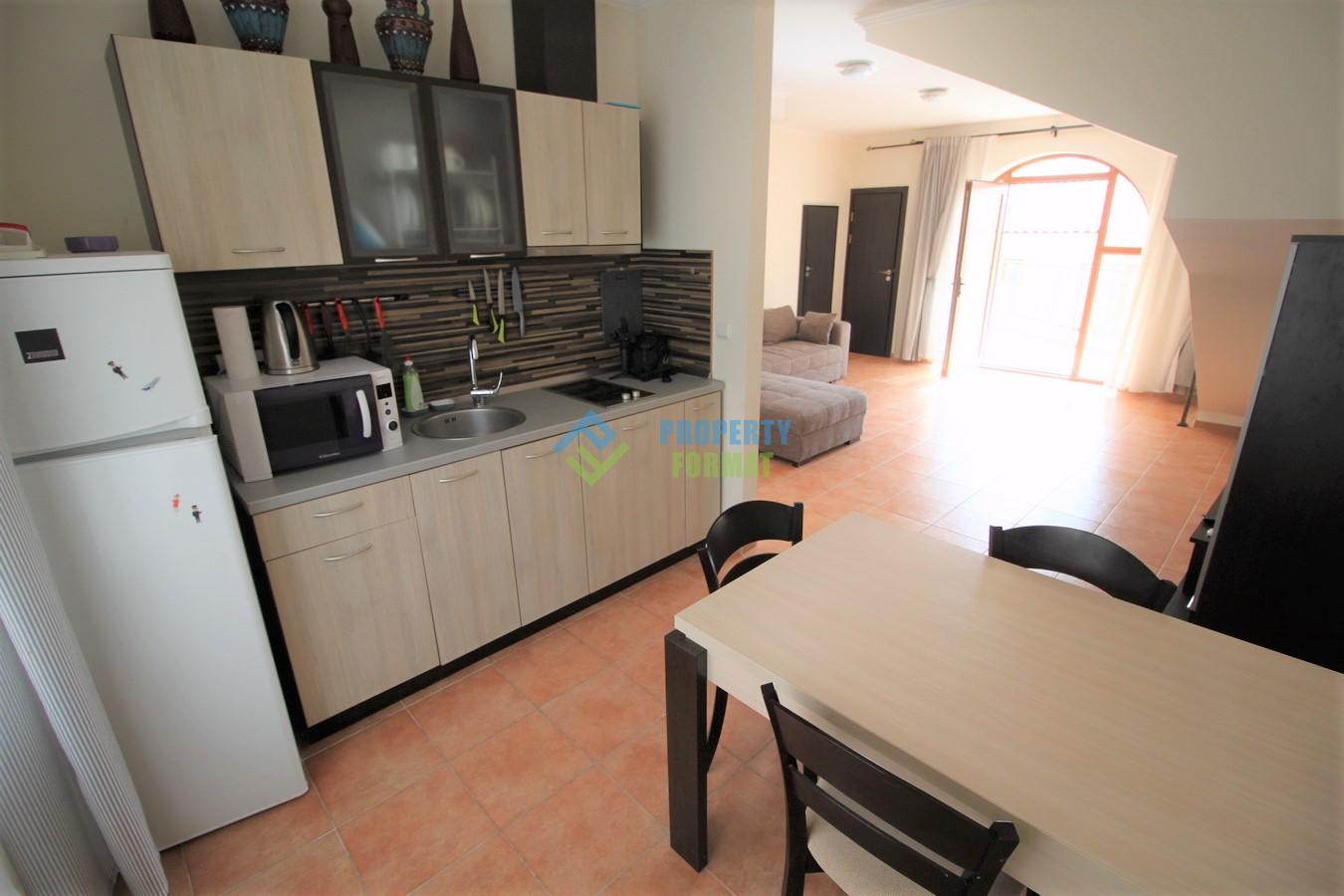 Предлагаме двуетажна вила с две спални с площ 110 кв.м. Апартаментът заема два етажа и половин вила. Прозорците от пода до тавана създават усещане за голямо пространство. На всеки етаж има санитарен възел, едната е оборудвана с пералня и душ кабина, а другата е оборудвана с вана. На втория етаж са разположени две спални, Апартаментът се продава напълно обзаведен. От прозорците и терасите се открива гледка към планината и морето.