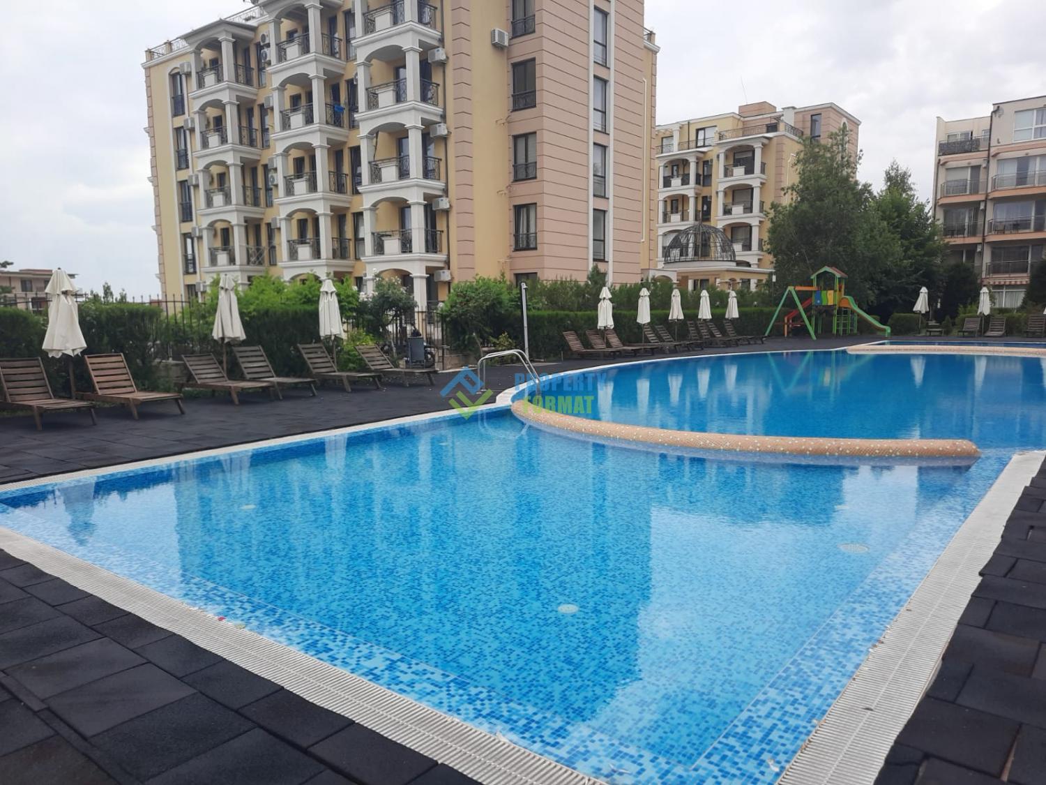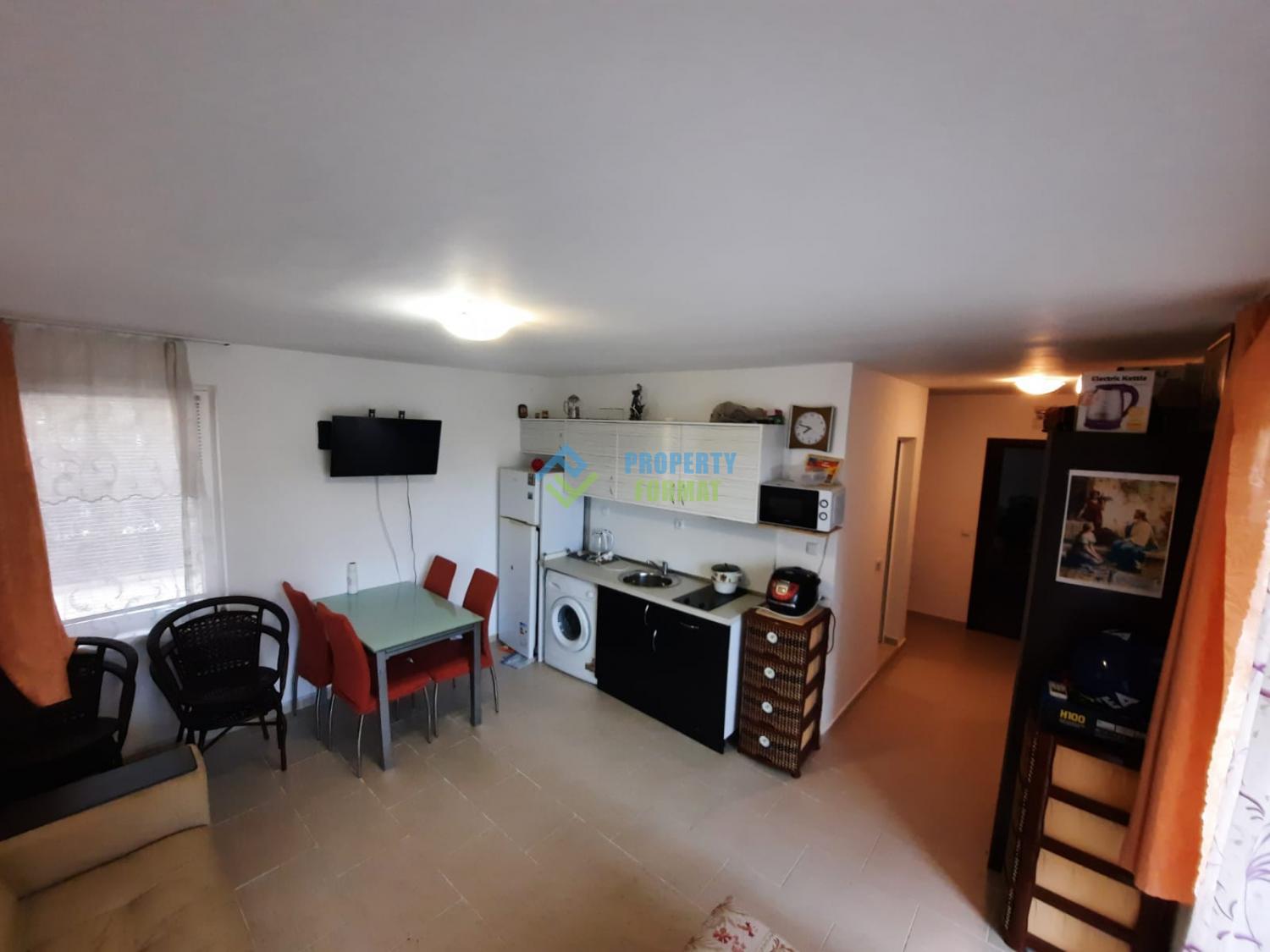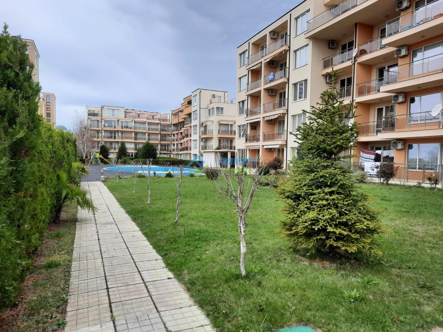 Апартаментът се намира на партерен етаж със самостоятелен достъп до просторна морава и достъп до басейна. Общата площ на апартамента е 59 кв.м. Апартаментът се състои от просторен коридор, който разделя дневната с кухненски боксс с излаз на терасата с уютна спалня. Апартаментът е напълно обзаведен и готов за постоянно живеене.