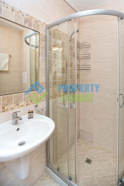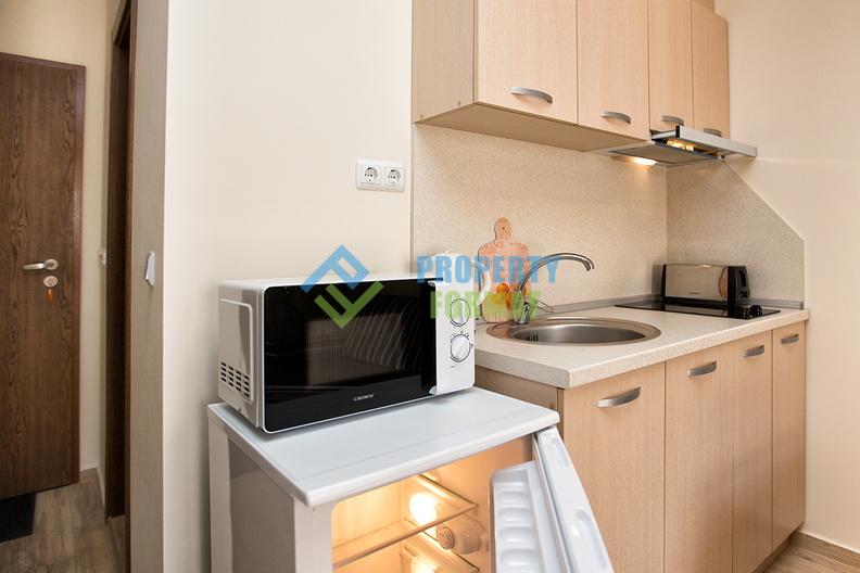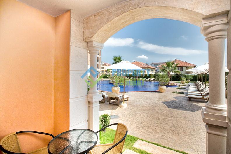 Продаваният апартамент е с площ 36 кв. м. оборудван е с необходимите мебели за живот и отдих, електроуреди, климатик и телевизор. Изходът от терасата води директно до басейна.