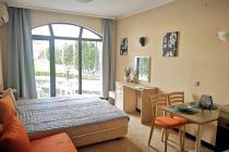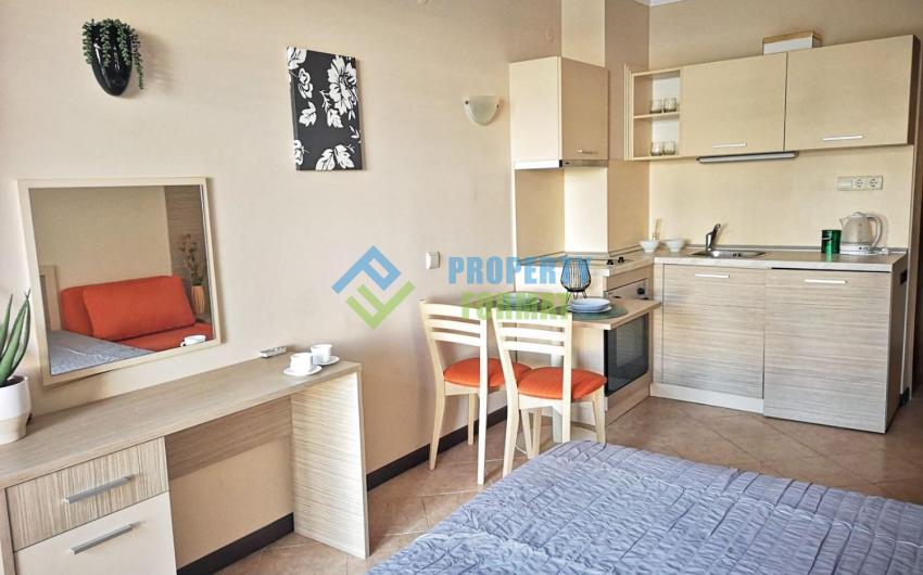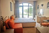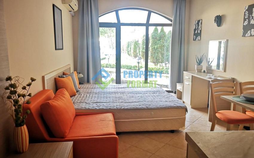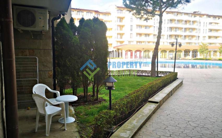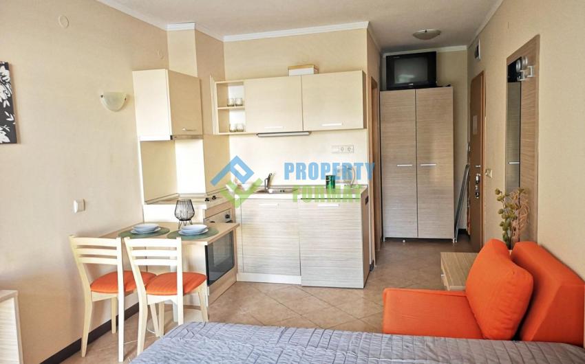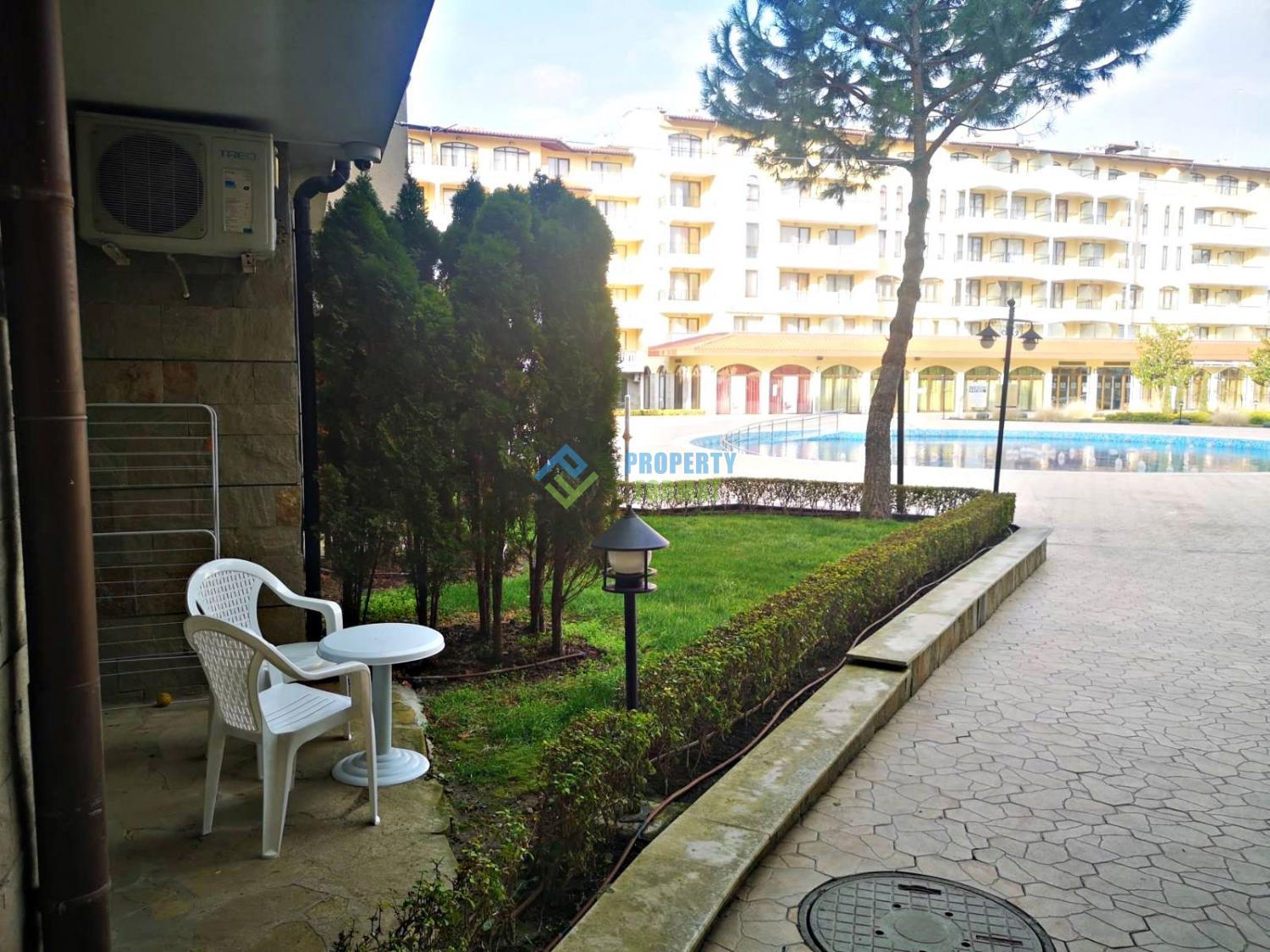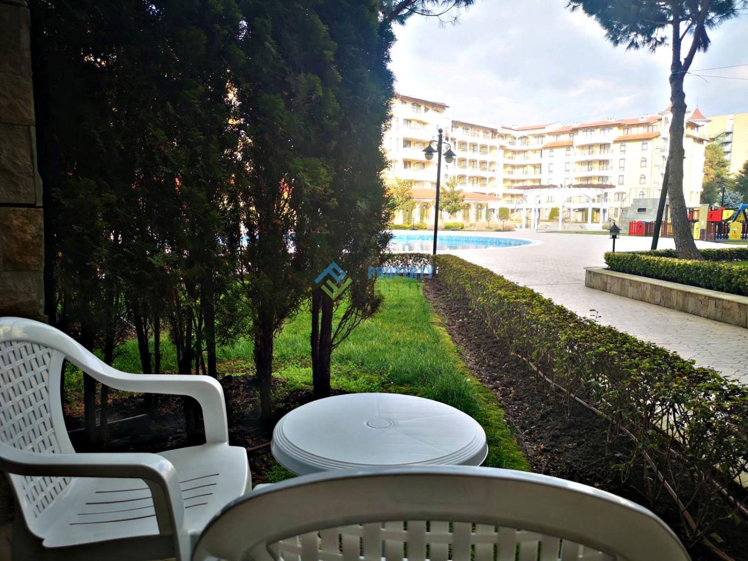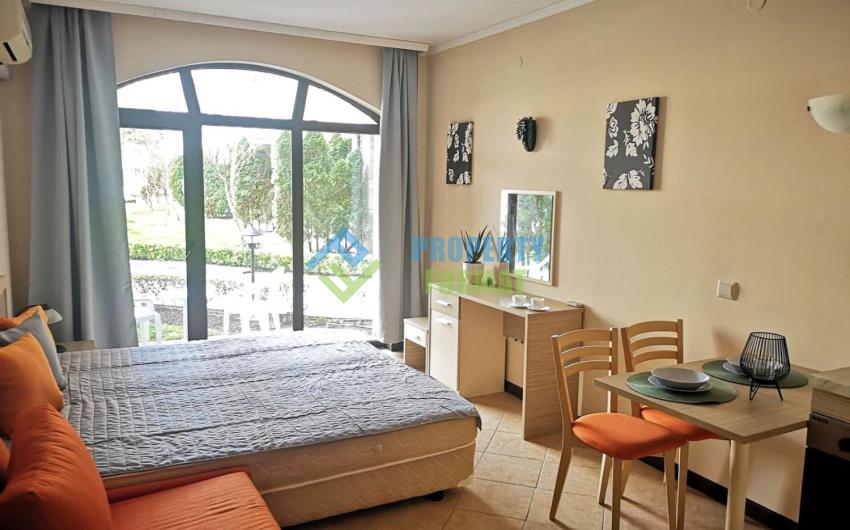 Студиото с тревна площ се намира на партера на Royal Sun. Интериорът на апартаментите е изпълнен по модерен начин и е оборудван с качествени мебели. Кухнята разполага с всички необходими уреди за готвене. В стаята има климатик, телевизор, кабелна телевизия, достъп до интернет. Банята разполага с душ кабина.