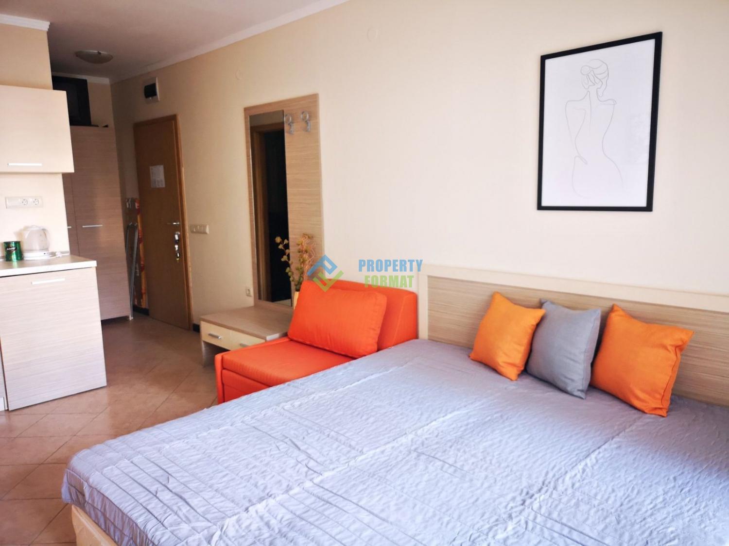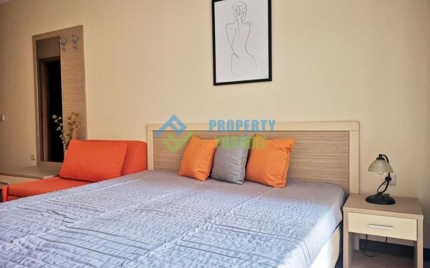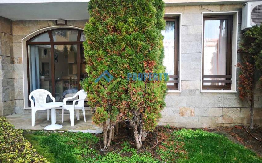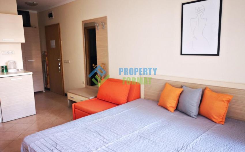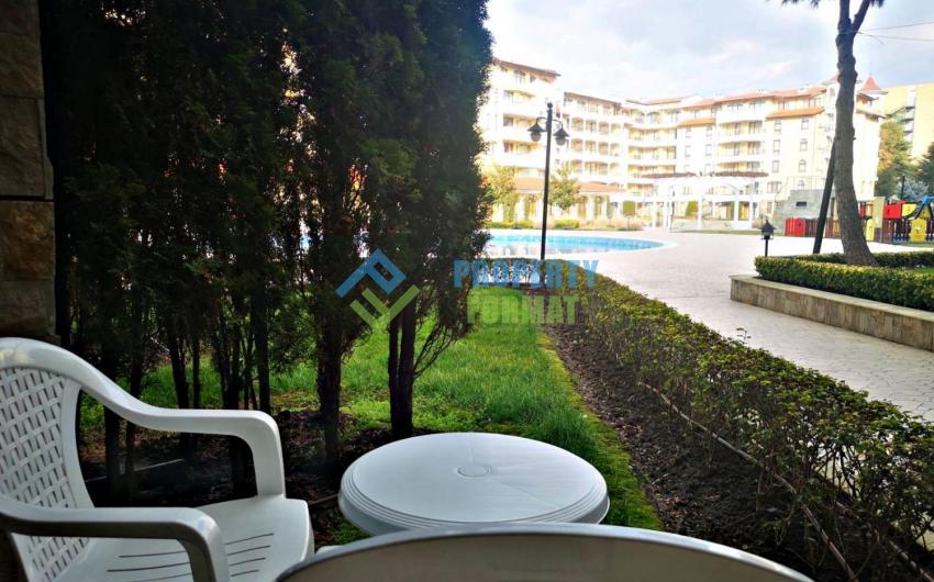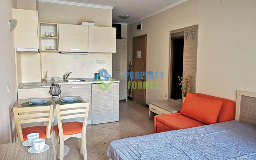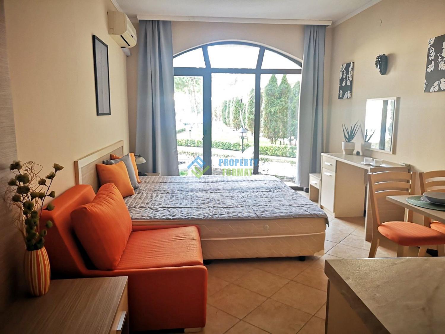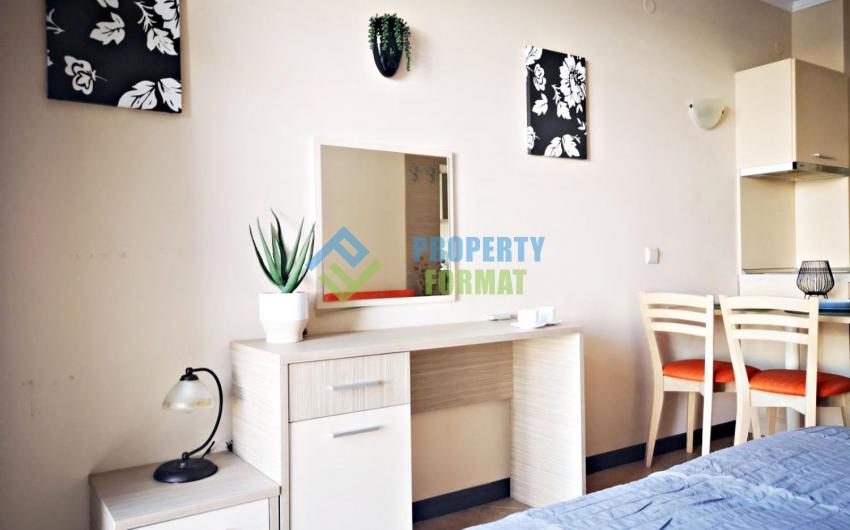 Студиото с тревна площ се намира на партера на Royal Sun. Интериорът на апартаментите е изпълнен по модерен начин и е оборудван с качествени мебели. Кухнята разполага с всички необходими уреди за готвене. В стаята има климатик, телевизор, кабелна телевизия, достъп до интернет. Банята разполага с душ кабина.