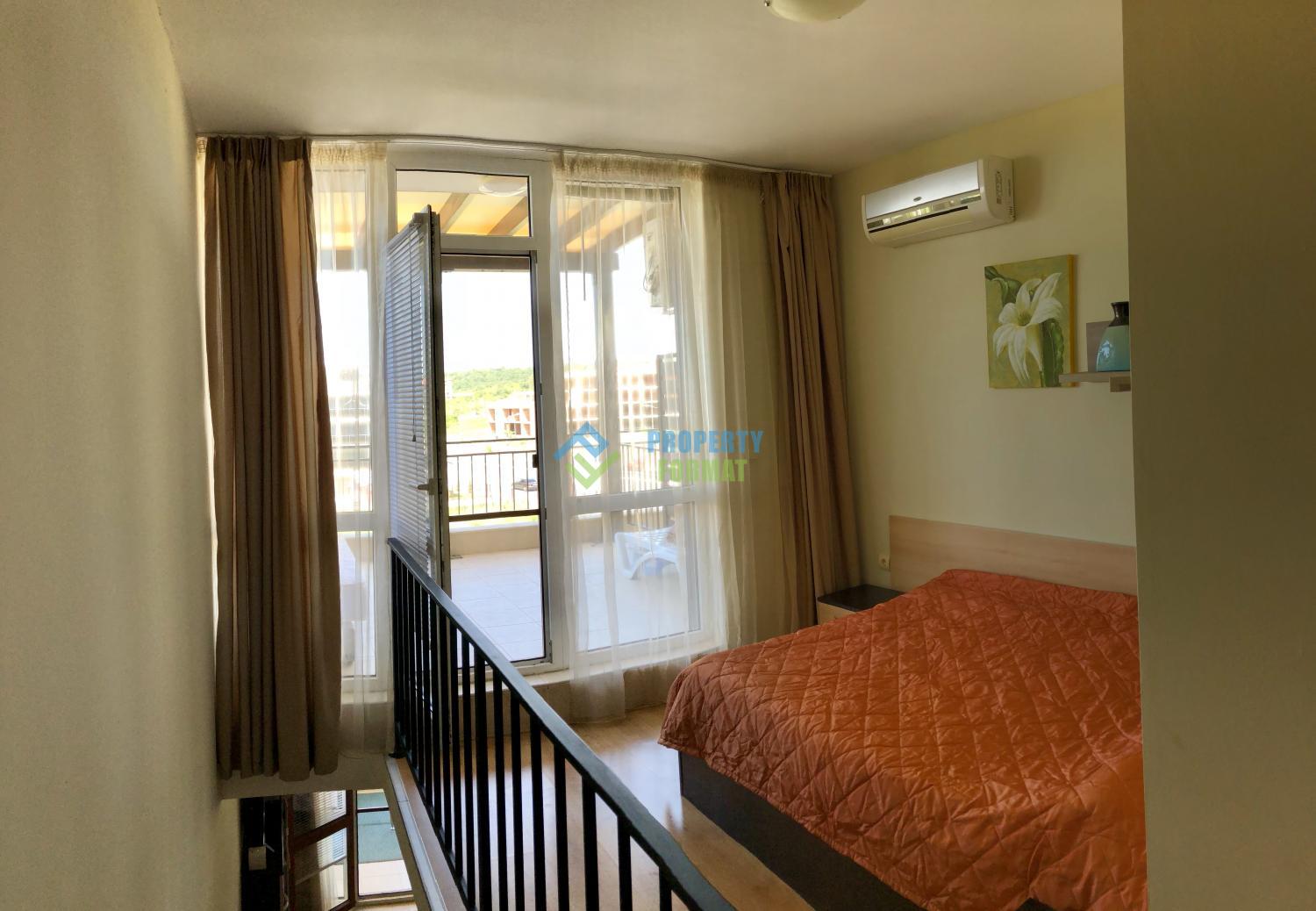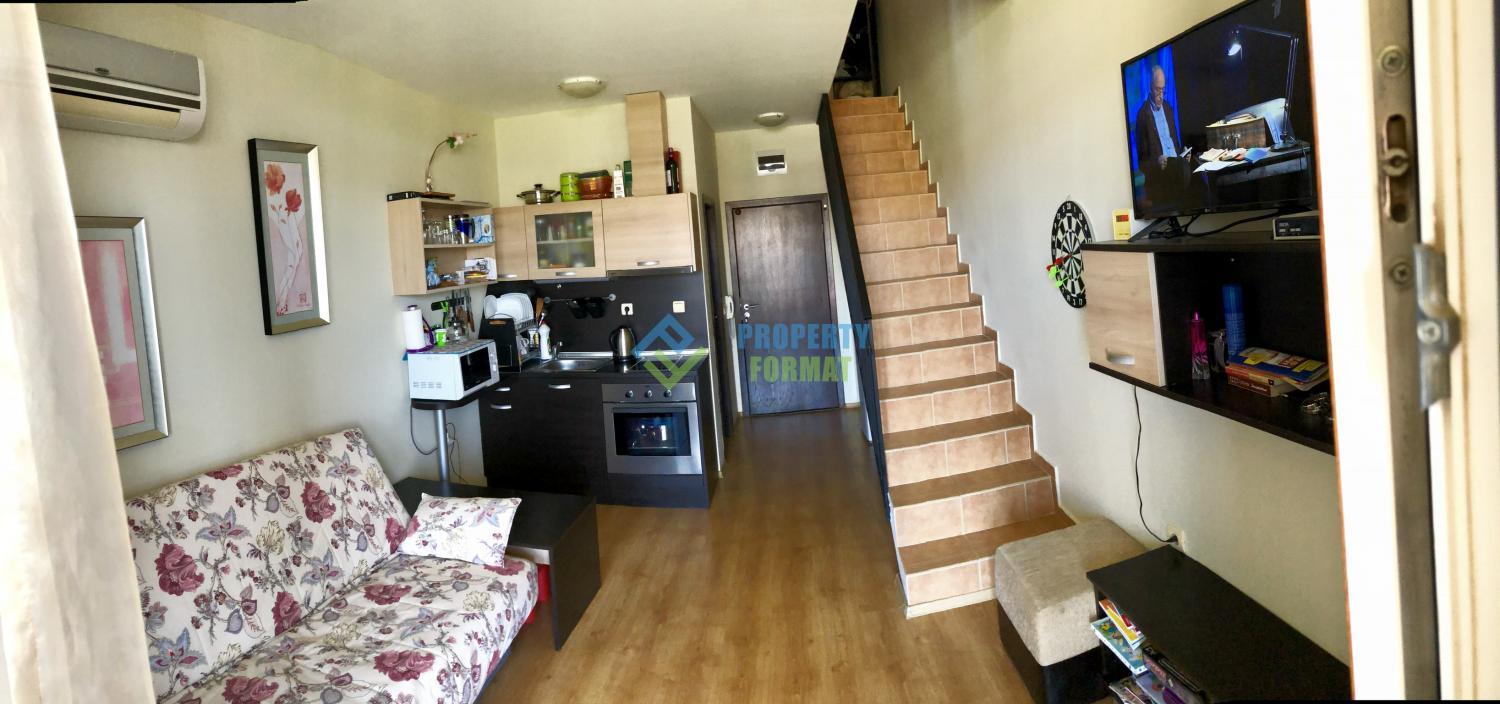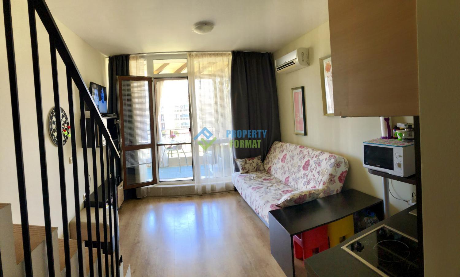 Продава се двуетажен мезонет в жилищен комплекс Луксор в елитния курорт Свети Влас. Входът в комплекса се осъществява с персонална чип карта.