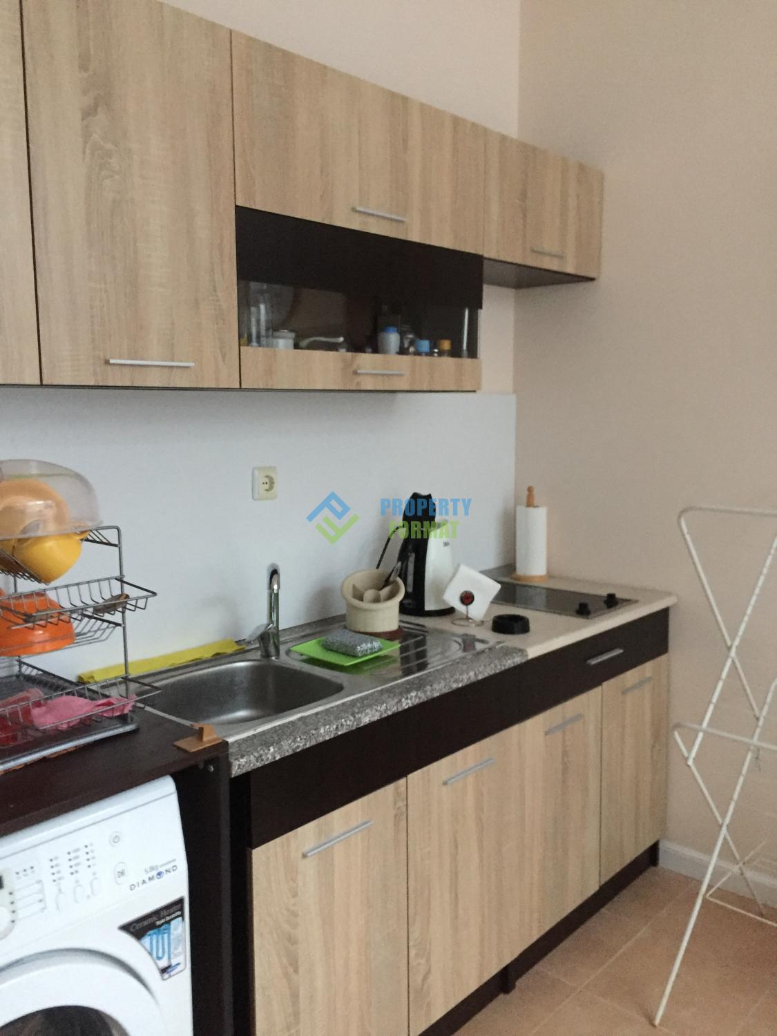 Разположението на апартамента е следното: антре, хол с кухненски бокс, обща баня с тоалетна, тераса. Банята разполага и с пълно санитарно оборудване, инсталирана е душ кабина.