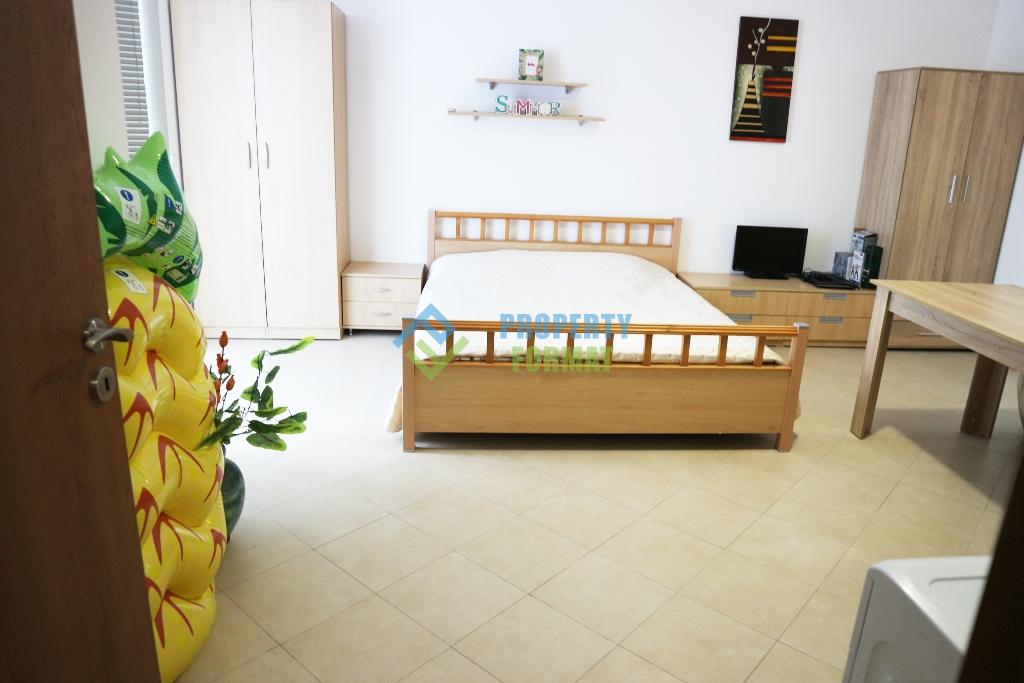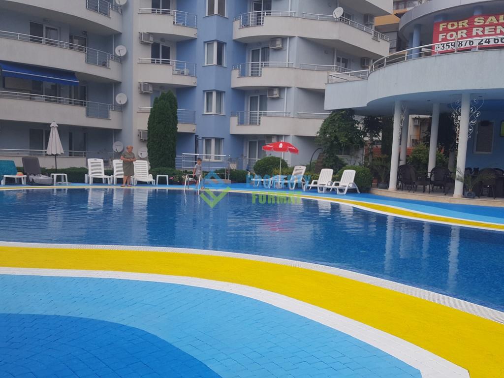 На вашето внимание се предлага просторно студио на 6-ти етаж в комплекс Лагуна. Студиото се състои от антре, хол, баня с тоалетна и балкон. Всички мебели и оборудване остават в апартамента. От прозореца има изглед към красивата форма на басейна.