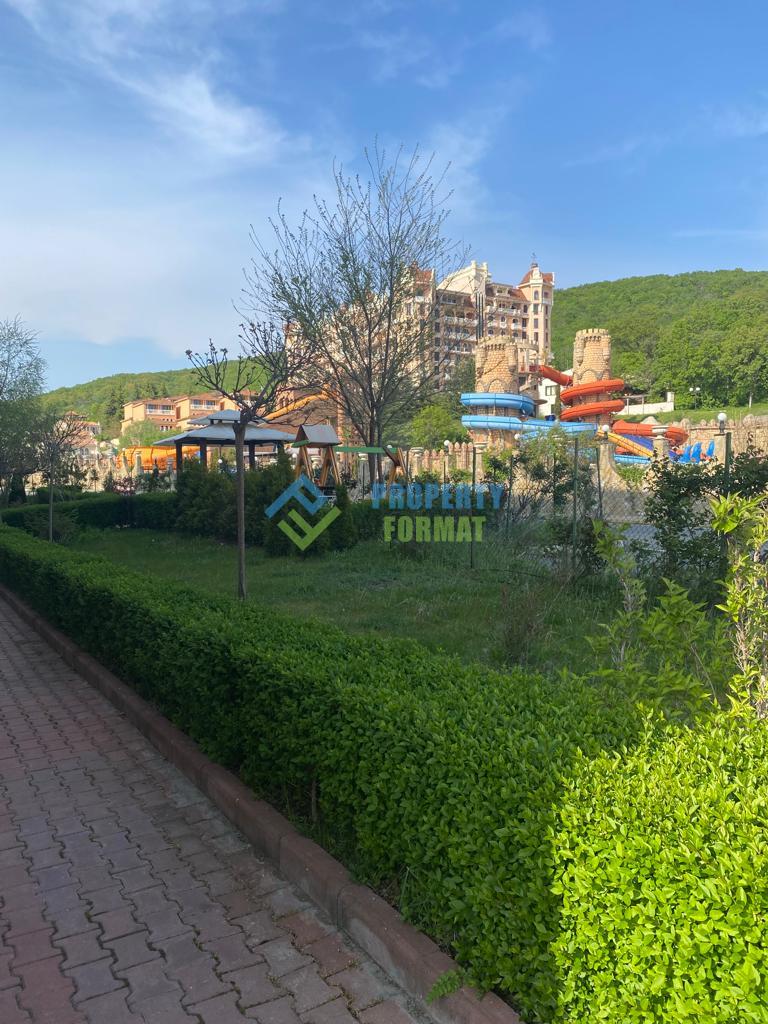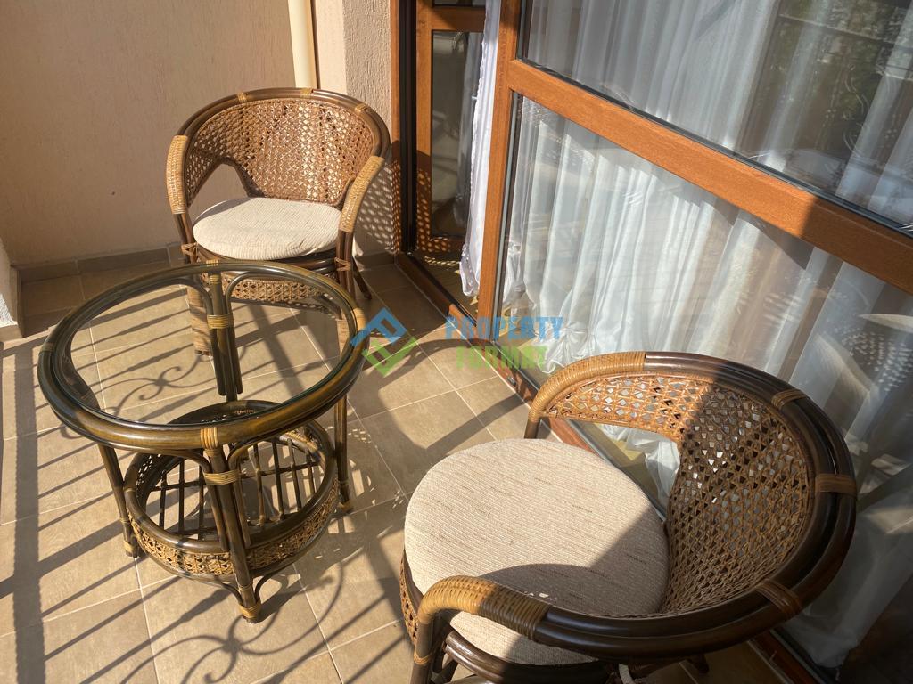 На територията на комплекса има малък басейн и зелени площадки. Такса поддръжка 9,6 евро/кв.м в год. Акт 15.