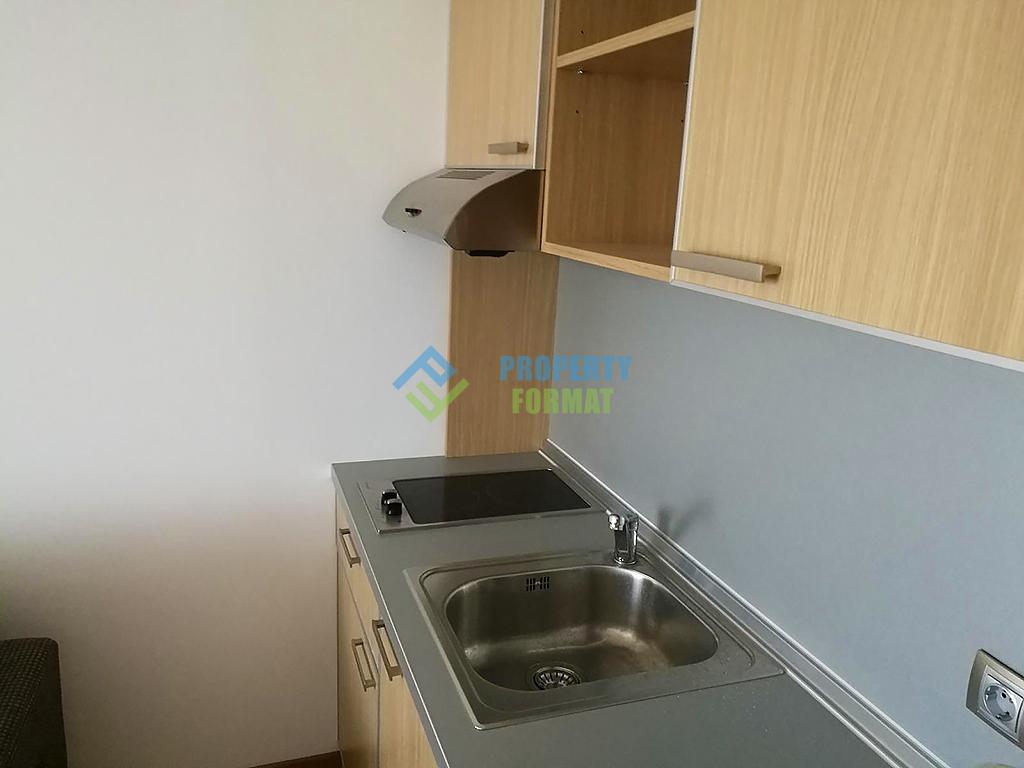 Апартамент-студио с площ от 44 кв. м е удобно разделен на кухненска част и зона за отдих. Налице са необходимите мебели и домакински уреди, климатик. От терасата се открива гледка към красивата територия на комплекса с басейн.