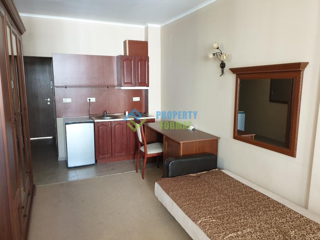 Квартира–студия располагает всей необходимой мебелью от стула до двуместной кровати. Из бытовой техники в наличии электроплита, вытяжка, холодильник, телевизор, кондиционер. На террасе будет приятно наслаждаться прекрасным видом за чашкой ароматного кофе.