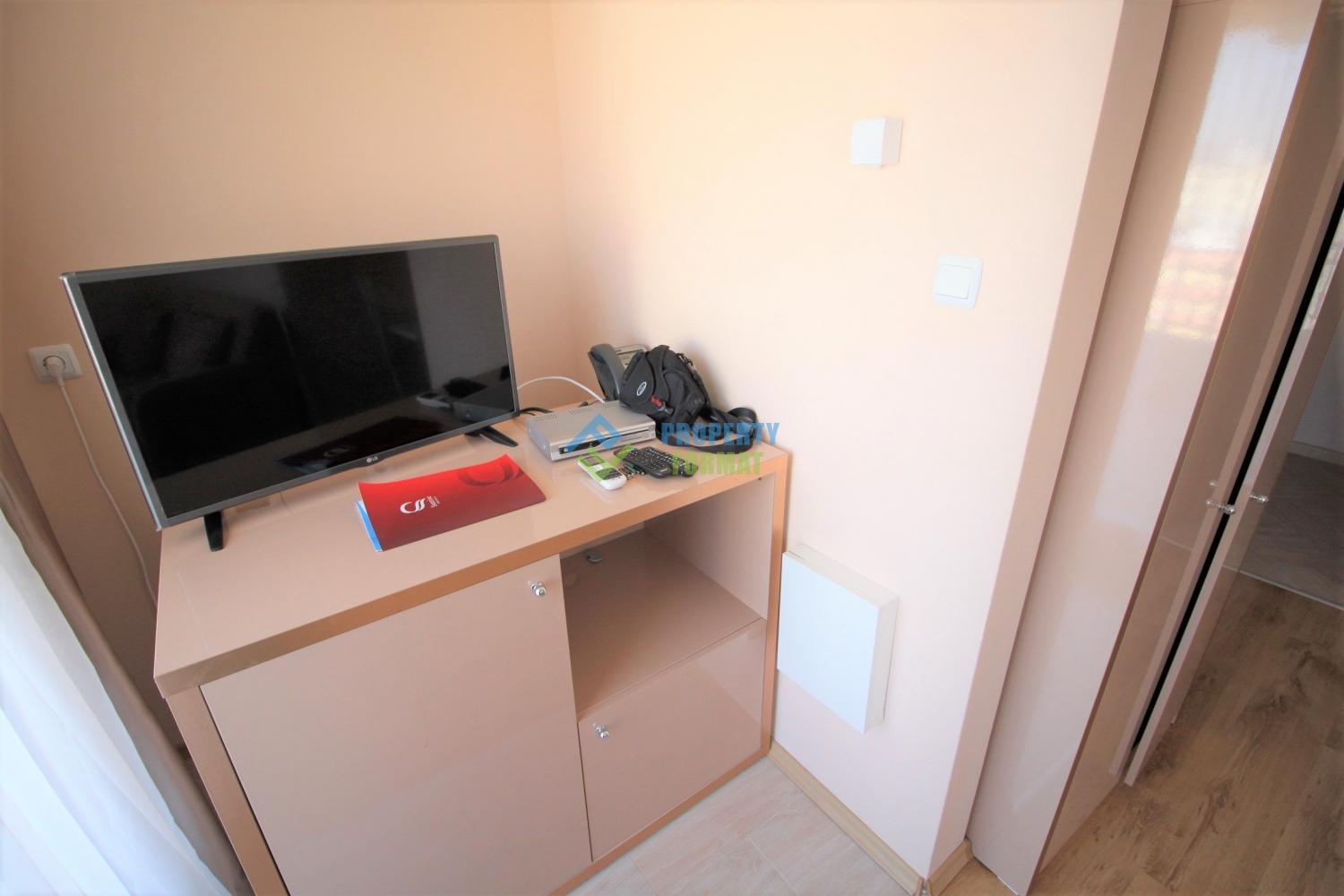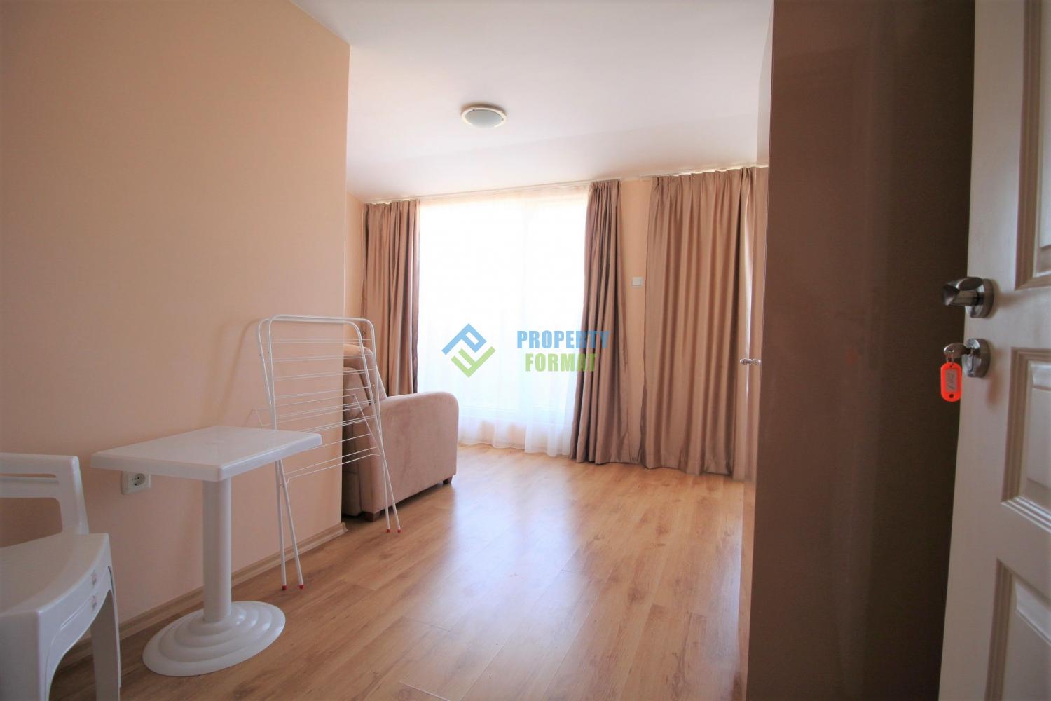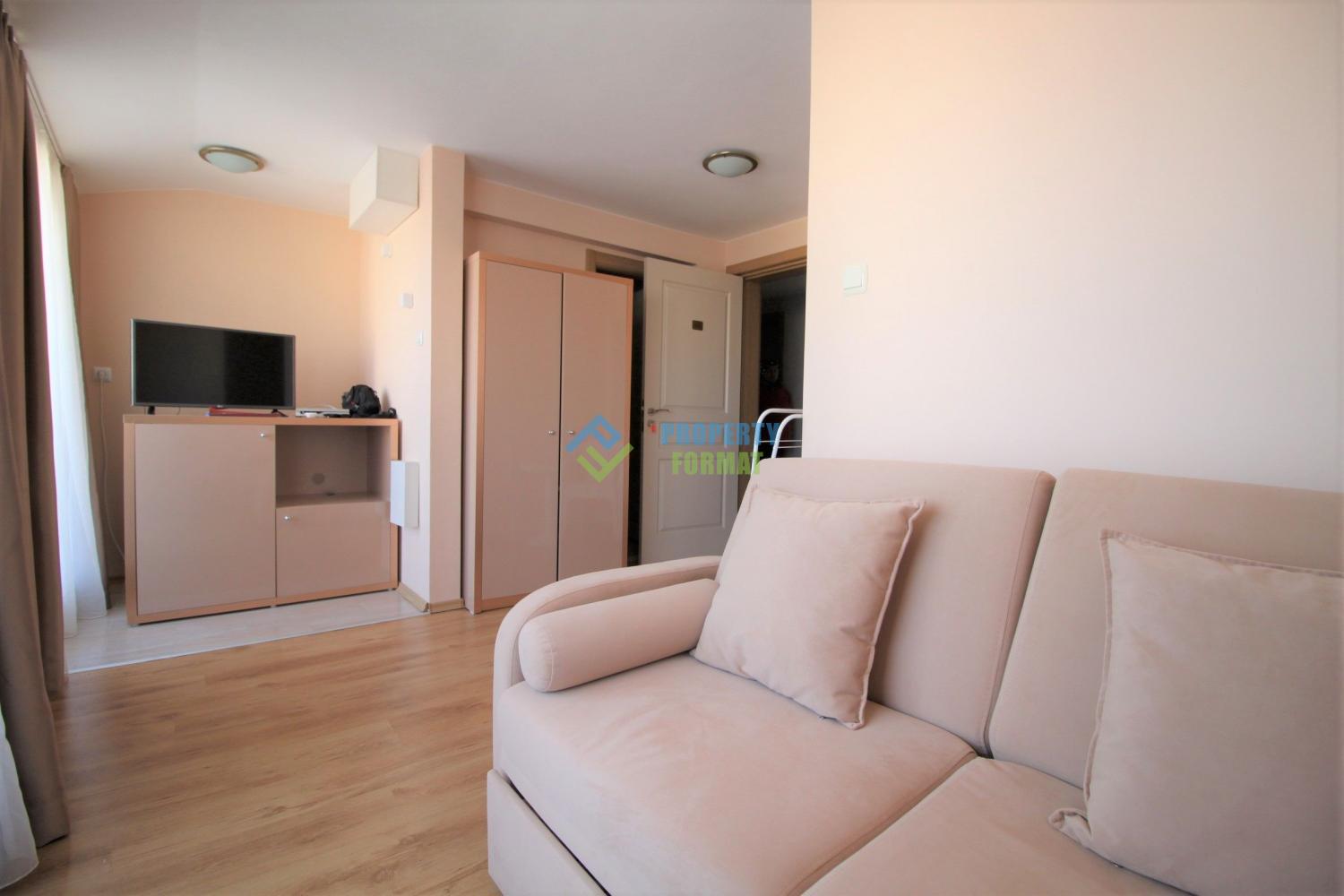 Продается студия на 6 этаже в комплексе Mesembria Palace в южной части Солнечнего берега. Розово-персиковые тона апартамента настраивают на спокойный отдых, а вид с балкона дает ощущение воздуха и пространства. Вся мебель и оборудование остаются для новых хозяев. На территории находятся красивой формы бассейн для взрослых с мостиком, детский бассейн, ресторан, детская площадка, площадка для занятий спортом, ресторан. В комплексе можно взять машину напрокат, есть место для парковки машины рядом с территорией.