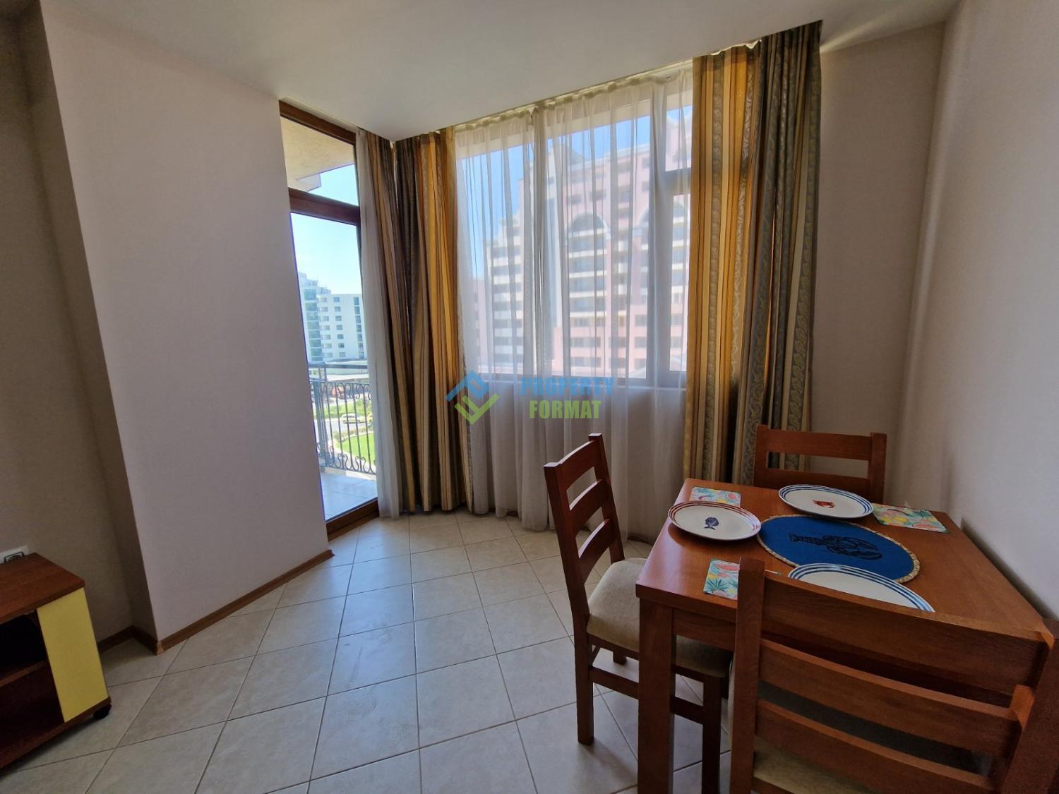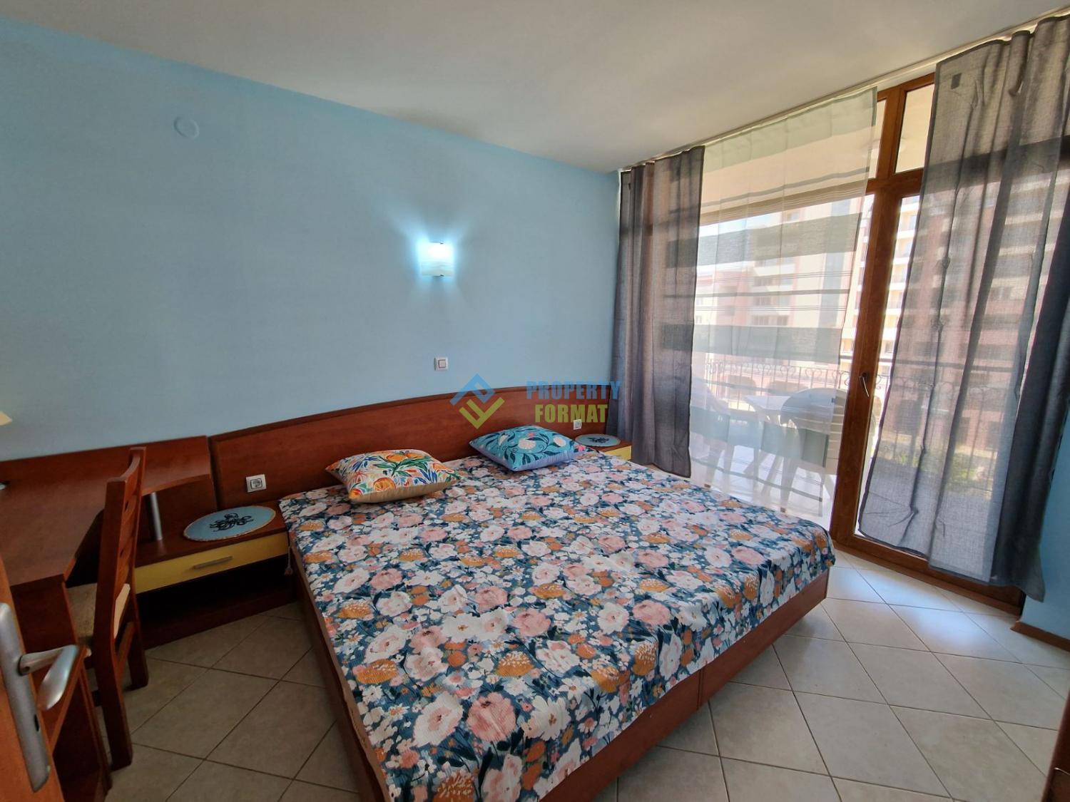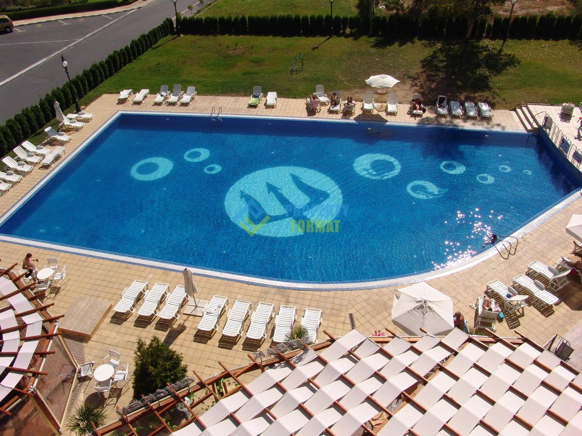 Большая двухкомнатная квартира с видом на бассейн и частичным видом на море, расположена в комплексе Poseidon на настоящей второй линии моря, с легким доступом к пляжу - Солнечный Берег. Квартира расположена на 5-м из 7-го этажа. Из гостиной и спальни есть выход на балкон. Мебель и обстановка в квартире в очень хорошем состоянии.