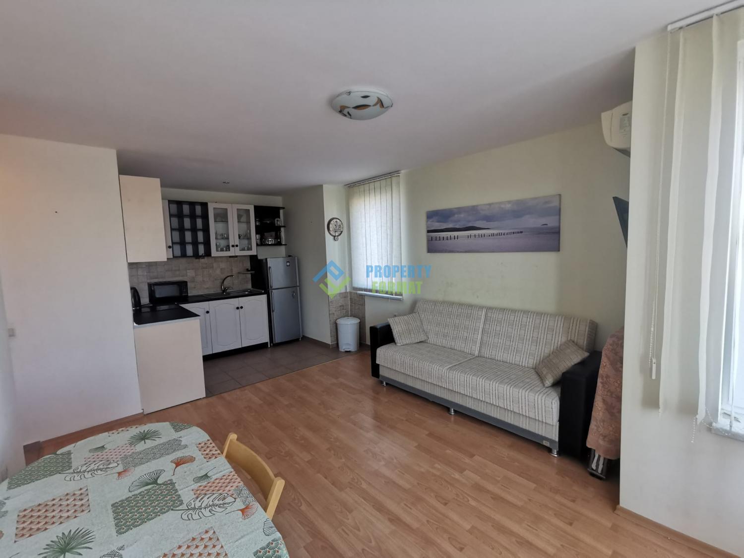 The apartment for sale consists of a living room combined with a kitchen area, a bedroom, a bathroom and a terrace. The apartment is fully furnished, has household appliances, the bathroom is equipped with a shower, a sink with a mirror, a toilet, a boiler. This property option is an excellent investment, both for permanent recreation and for successful rental.