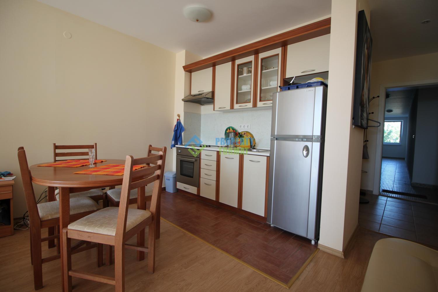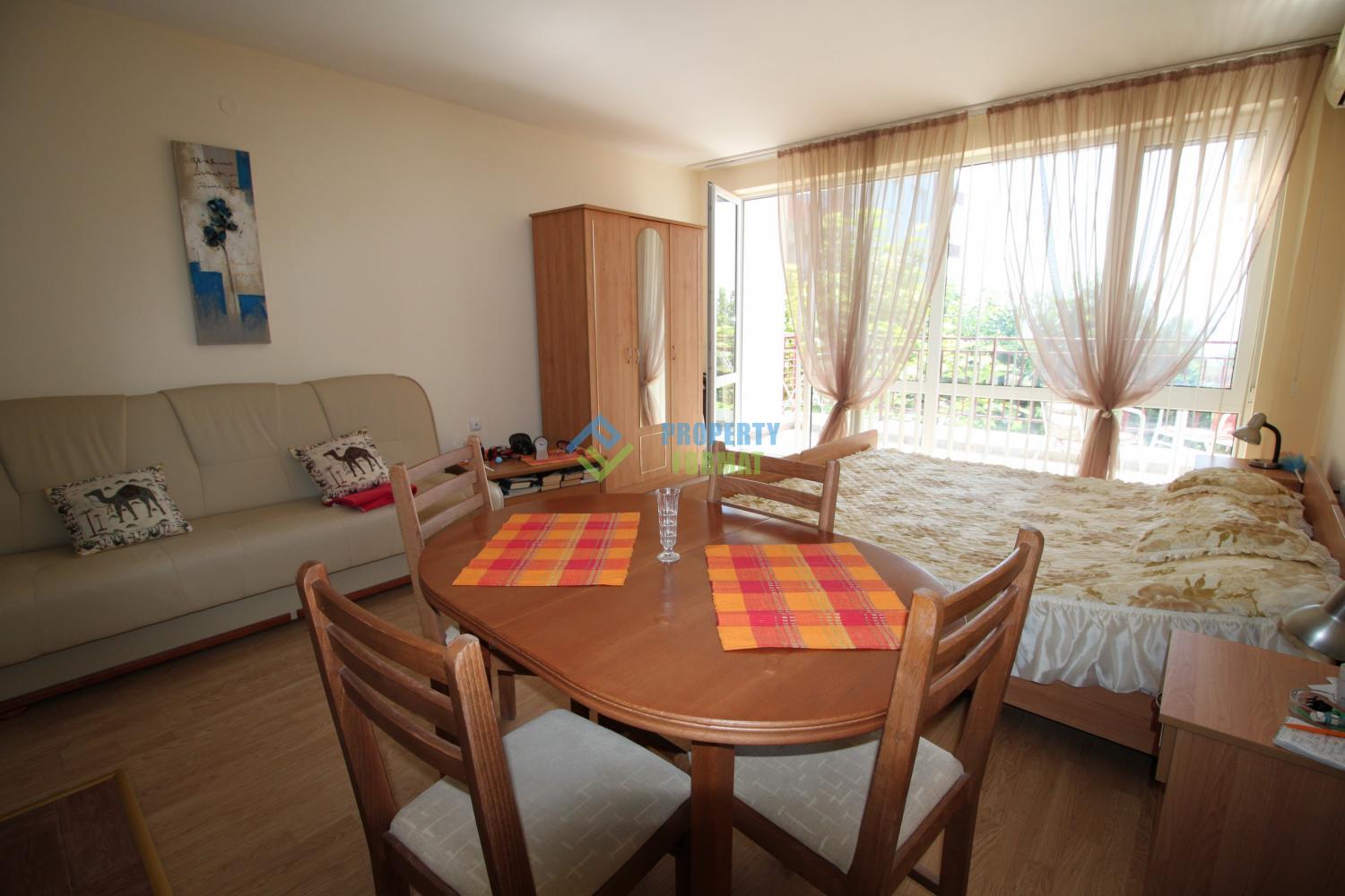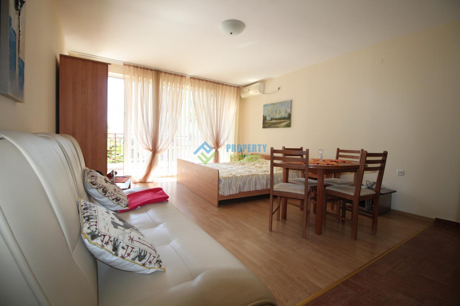 Comfortable Studio of 43 square meters, comfortably furnished. Kitchen is equipped with kitchenware, appliances and refrigerator. Air conditioned and washing machine in the bathroom. The balcony offers stunning views of the sea and the complex.
