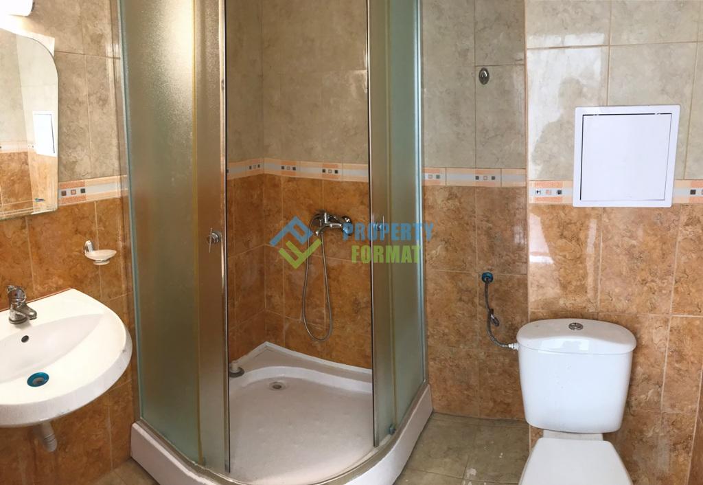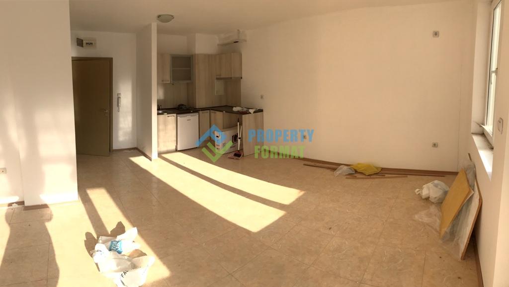 Spacious Studio with an area 47 sq. m. sold Unfurnished, but with kitchen and refrigerator. The bathroom is equipped with shower cabin, sink with mirror, toilet. From your private terrace overlooking the grounds with a Playground.