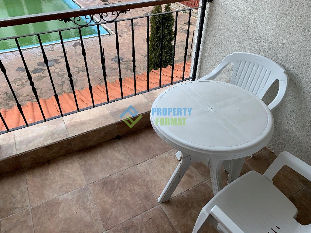 Spacious apartment of 65 square meters has all the necessary furniture, household appliances and electrical appliances. The bedroom has a double bed and a wardrobe. On the balcony you can relax at a table overlooking the pool.