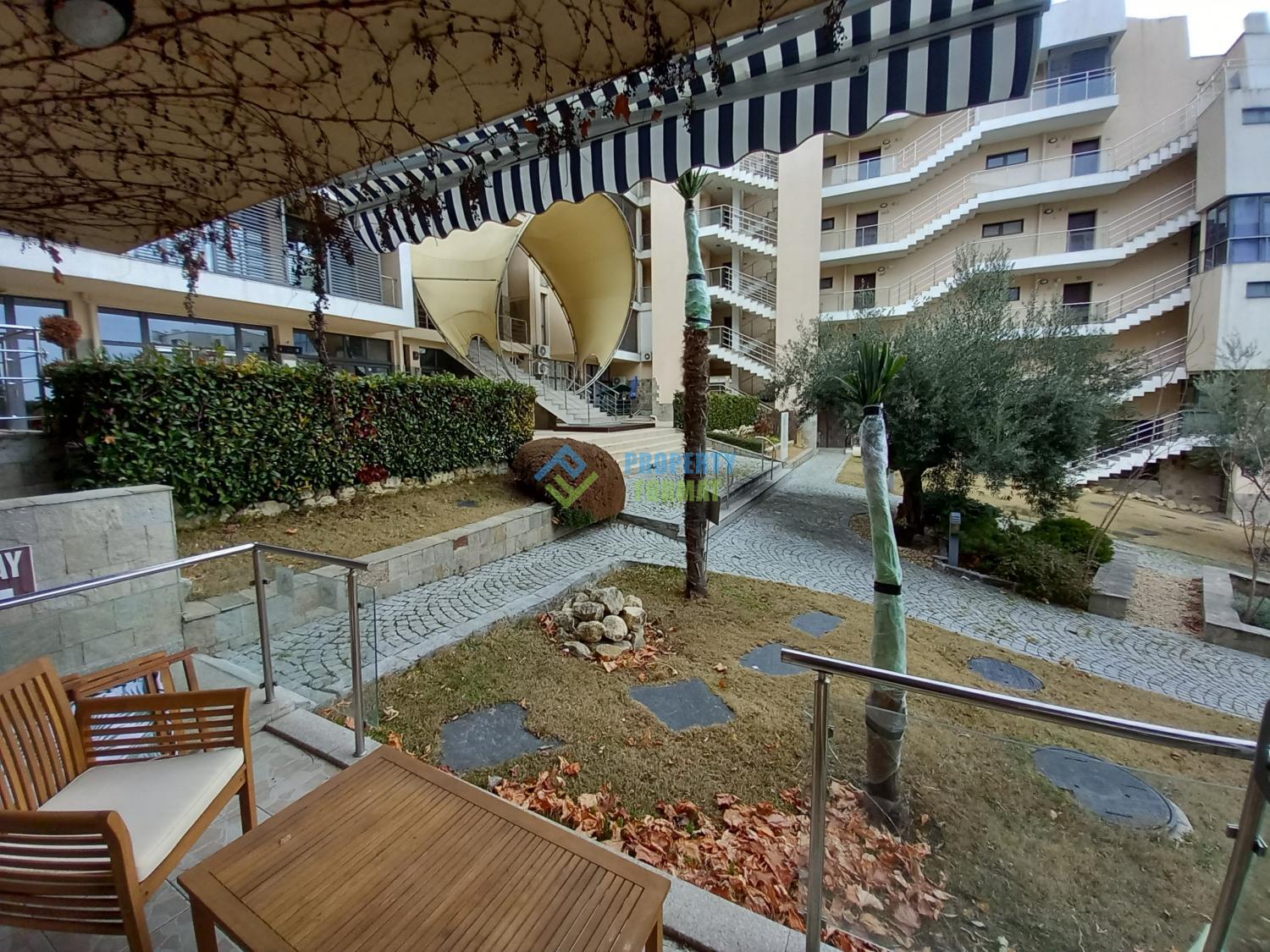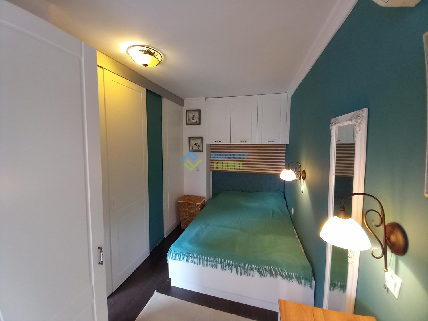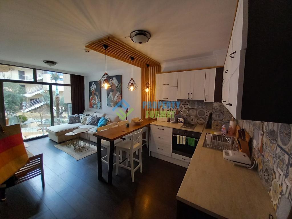 The apartment is located on the ground floor, with a total area of 43 sq.m., and consists of a living room with a dining area, a bedroom, and a bathroom. The apartment is equipped with modern furniture and appliances and has everything you need for a comfortable stay and relaxation. The complex has a swimming pool for adults and children, a garden, a jacuzzi and a children's playground, all with a beautiful view of the sea.