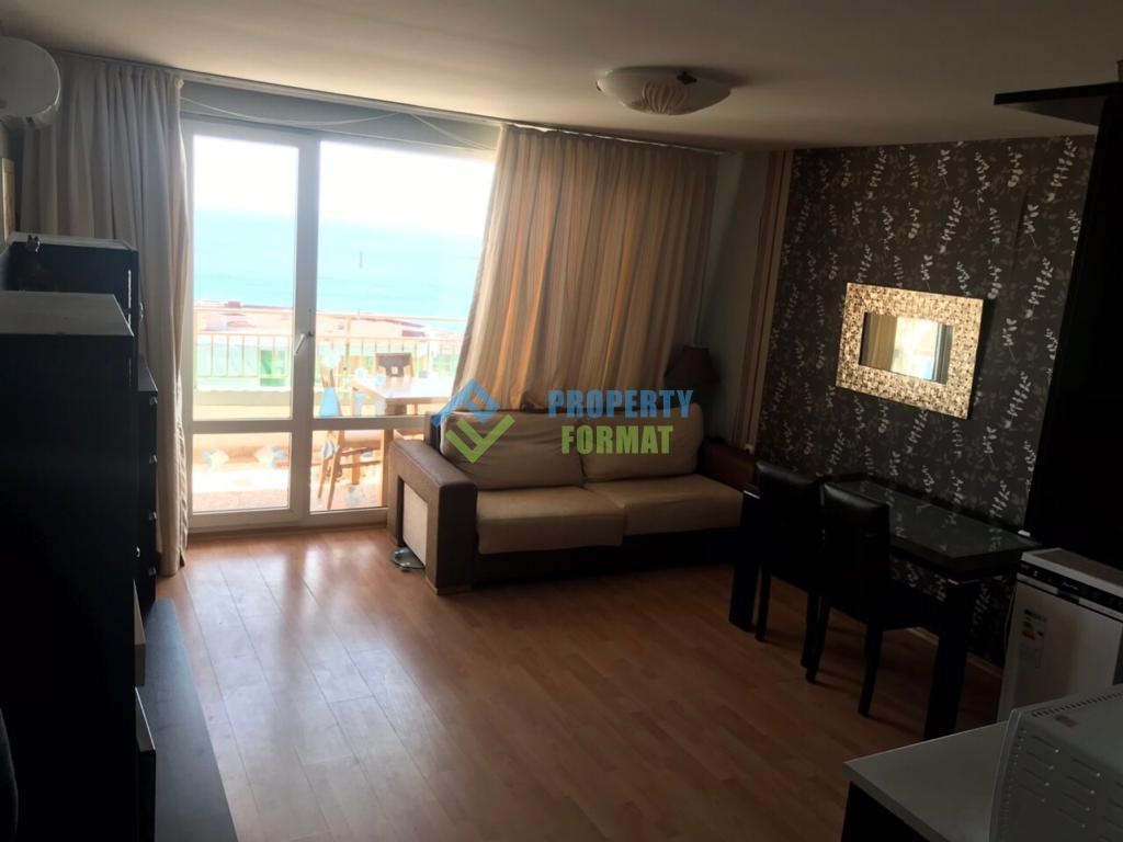 Two-room apartment for sale in the Imperial Fort complex, Saint Vlas. Its area is 68 sq.m. It consists of a living room with a kitchenette, a bedroom, a bathroom with a toilet and a balcony with a breathtaking view of the sea.