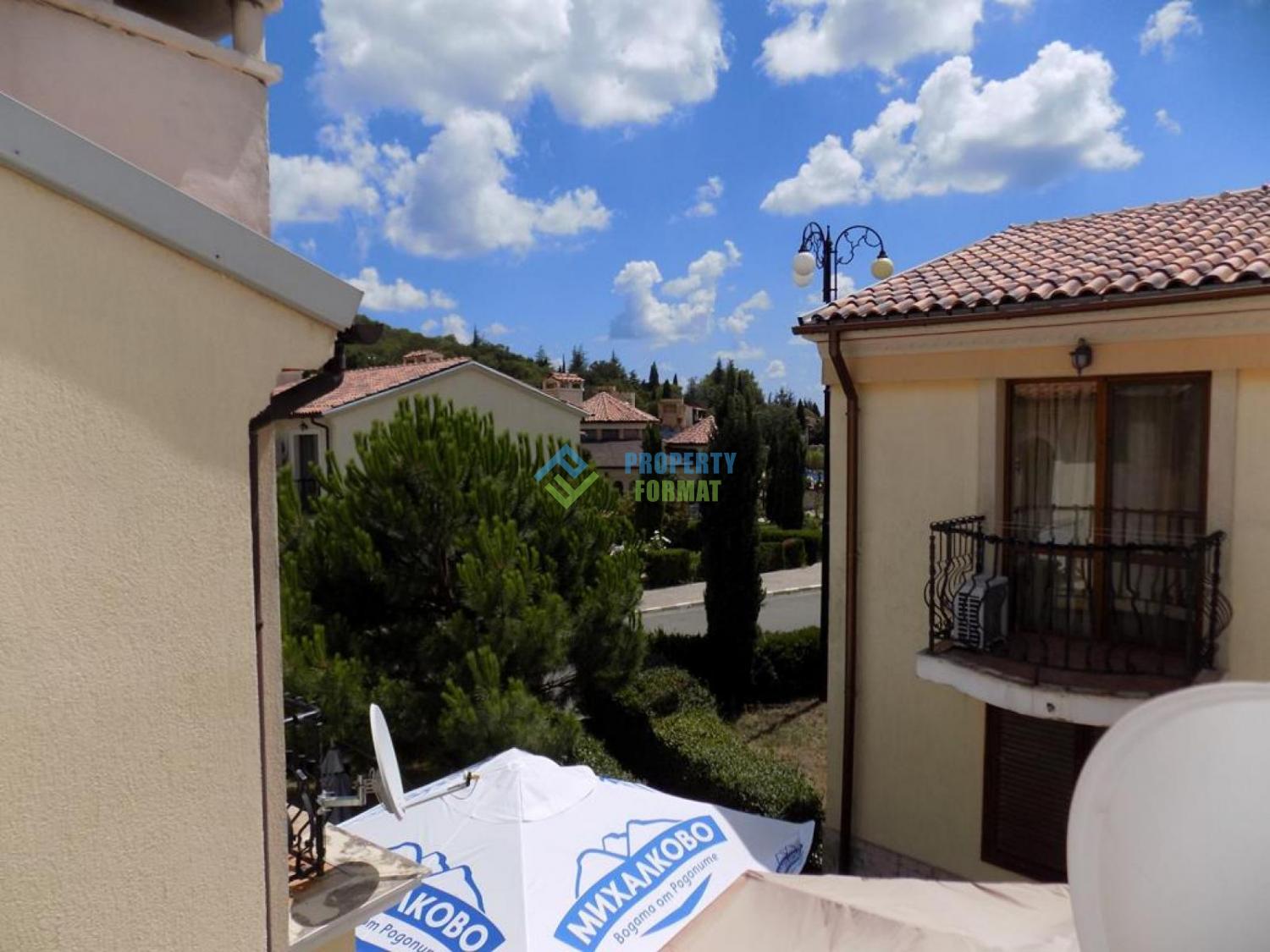 We offer a two-room apartment on the 2nd floor in the Villa Romana complex in a quiet and peaceful place. The complex consists of two-storey houses of the same type. Lawn grass is planted in front of the house, thuja is planted around the perimeter. To the right and left of the house there is a barbecue area. The plot is landscaped and maintained by a service company, cleaning and service support of the villa is possible. Heating is provided by means of air conditioners. Two balconies overlook the courtyard, the mountains and the green forest.