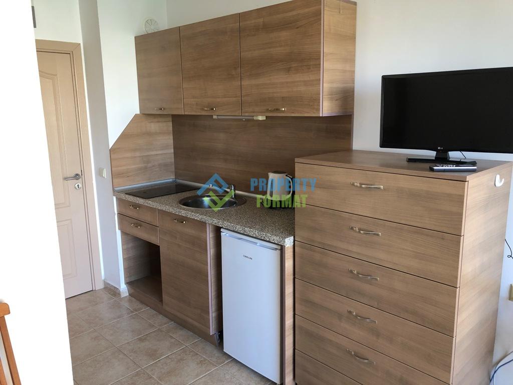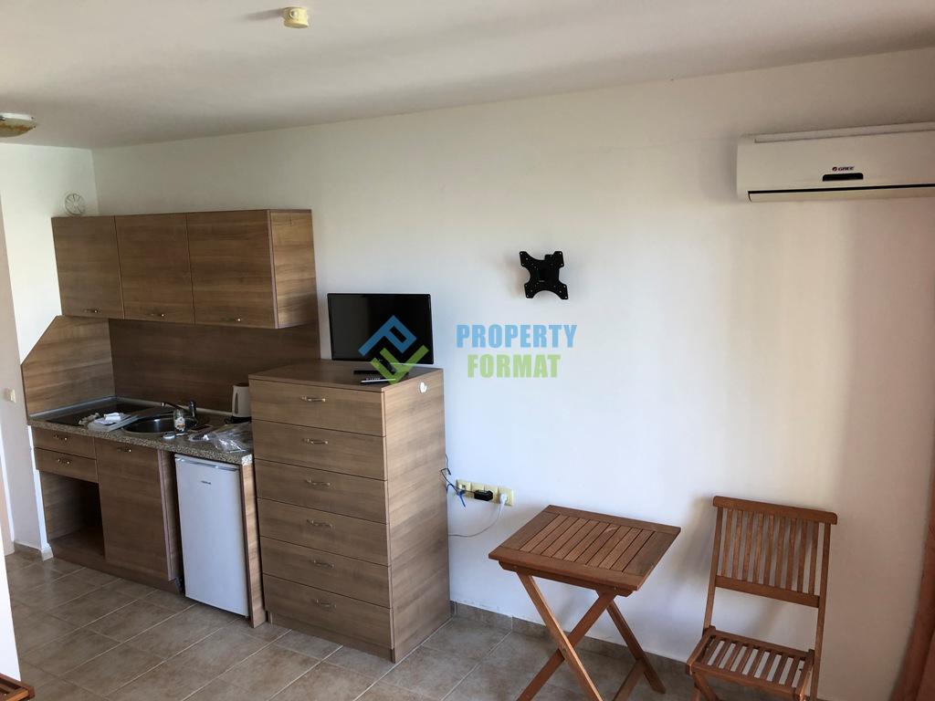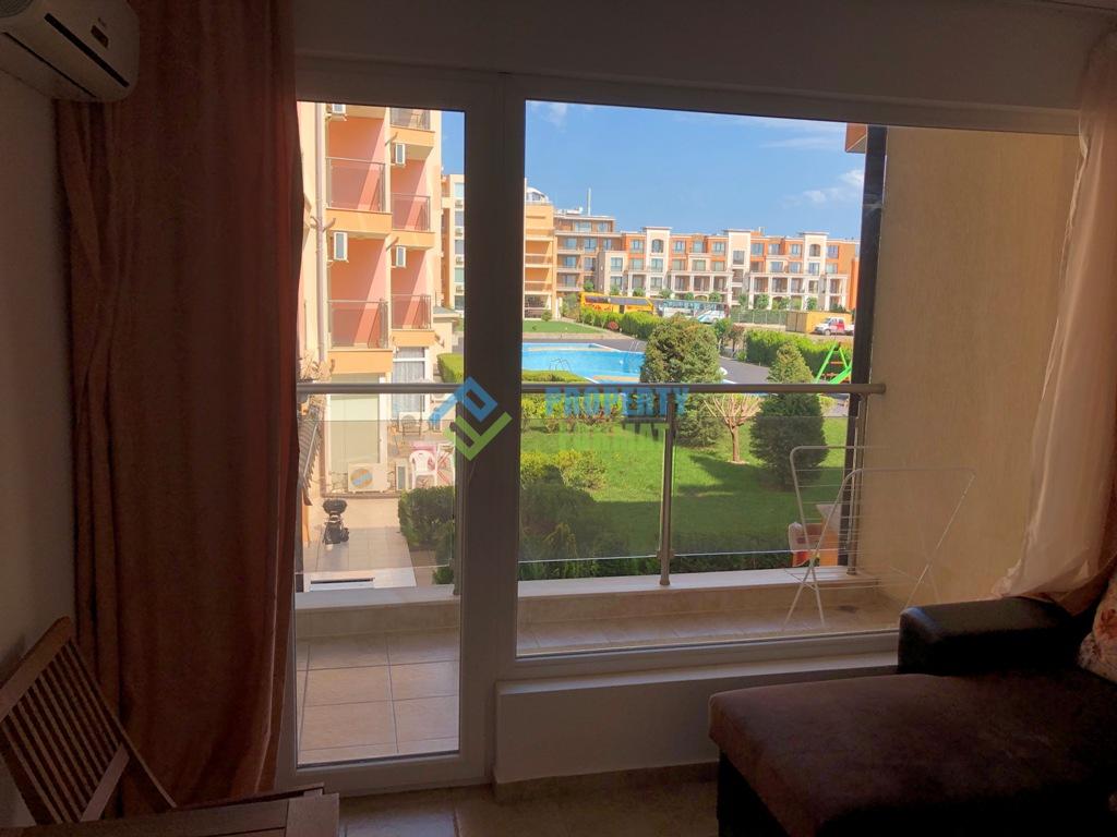 Sold Studio of 33 sq. m has a couch, a chest of drawers, kitchen with fridge, TV, air conditioning, fully equipped bathroom. The balcony offers beautiful views of the landscaped grounds with swimming pool.