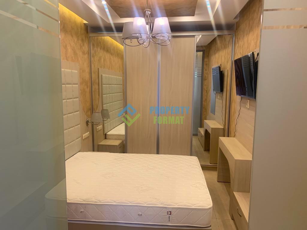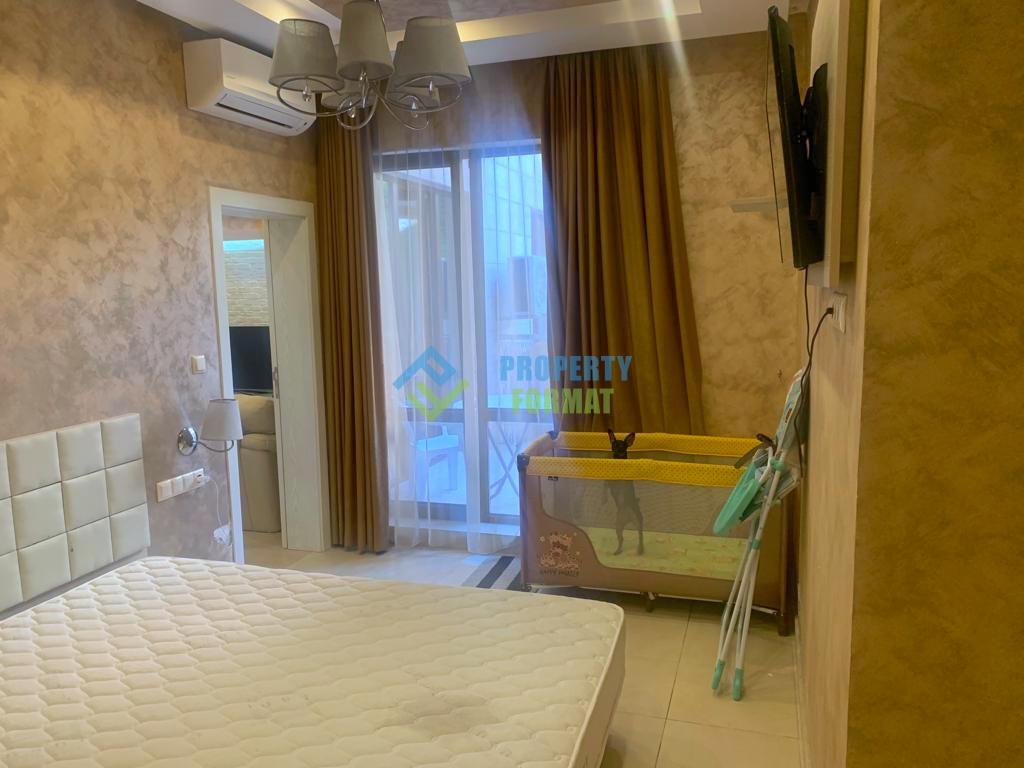 We present to your attention a new apartment in the complex "Tarsis Nova". The apartment is located on the ground floor, its area is 86 sq.m. It consists of a living room with a kitchen, 2 bedrooms, 2 bathrooms and a terrace. The apartment has a designer renovation, it is equipped with high-quality furniture and household appliances.