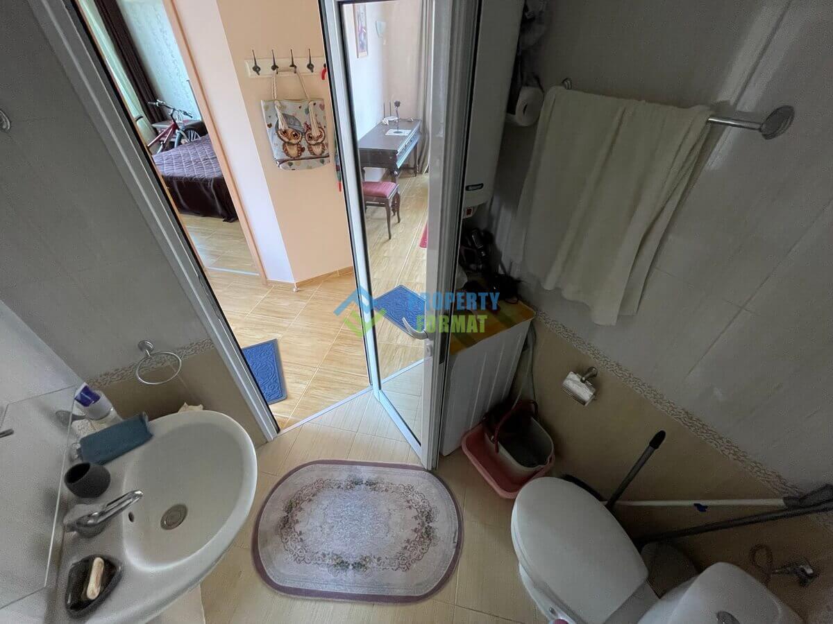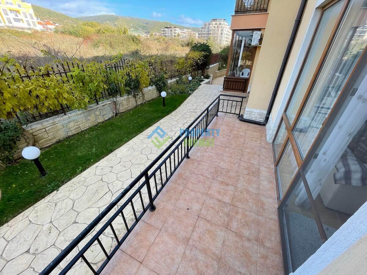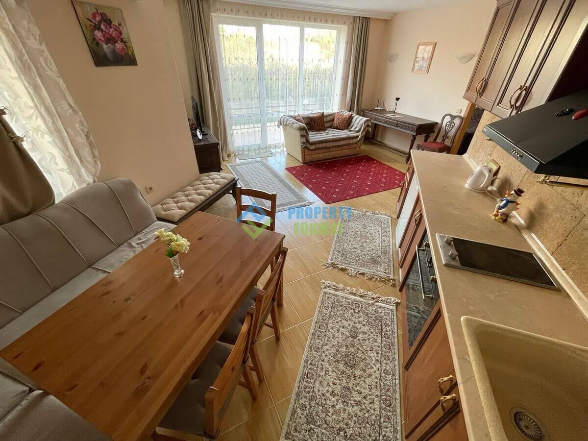 In a comfortable complex located in a quiet area in the resort town of Sveti Vlas, we offer a two-room apartment on the ground floor. The apartment has a dedicated area for cooking, a large kitchen equipped with everything you need. All equipment and furniture remain for the new owner. Floor-to-ceiling windows create the feeling of a large space. The apartment is suitable for year-round living or renting.