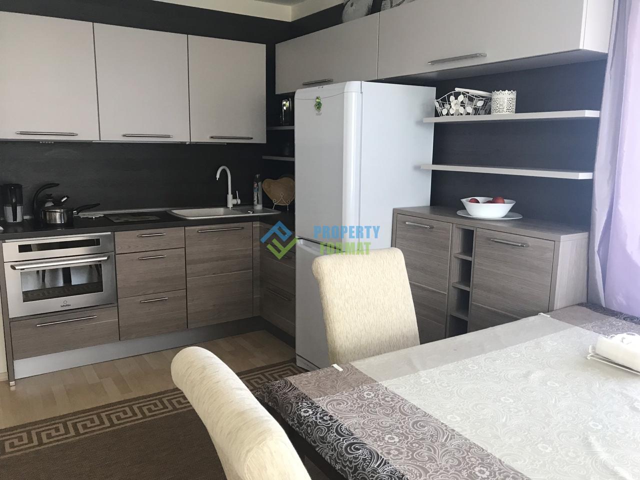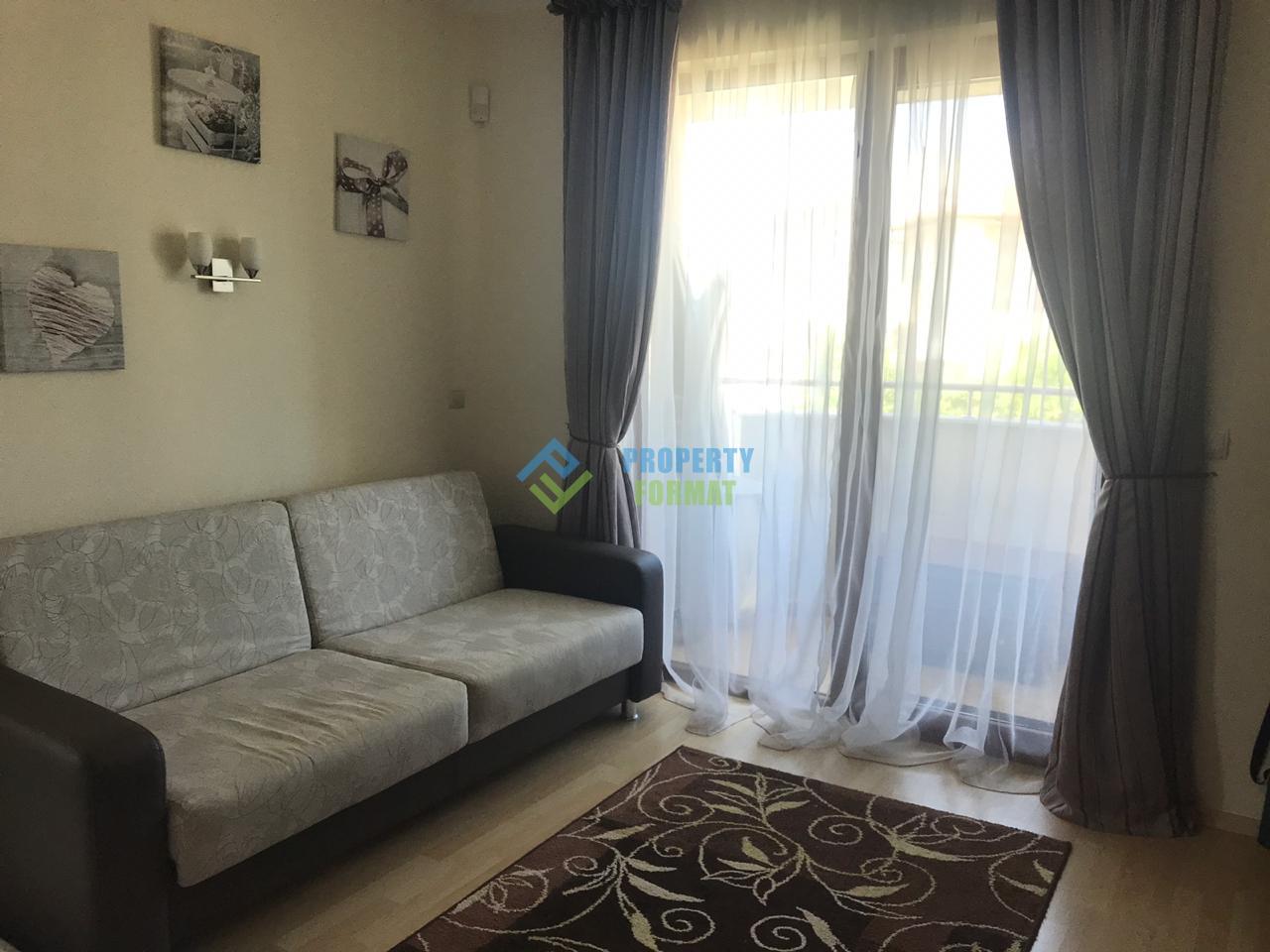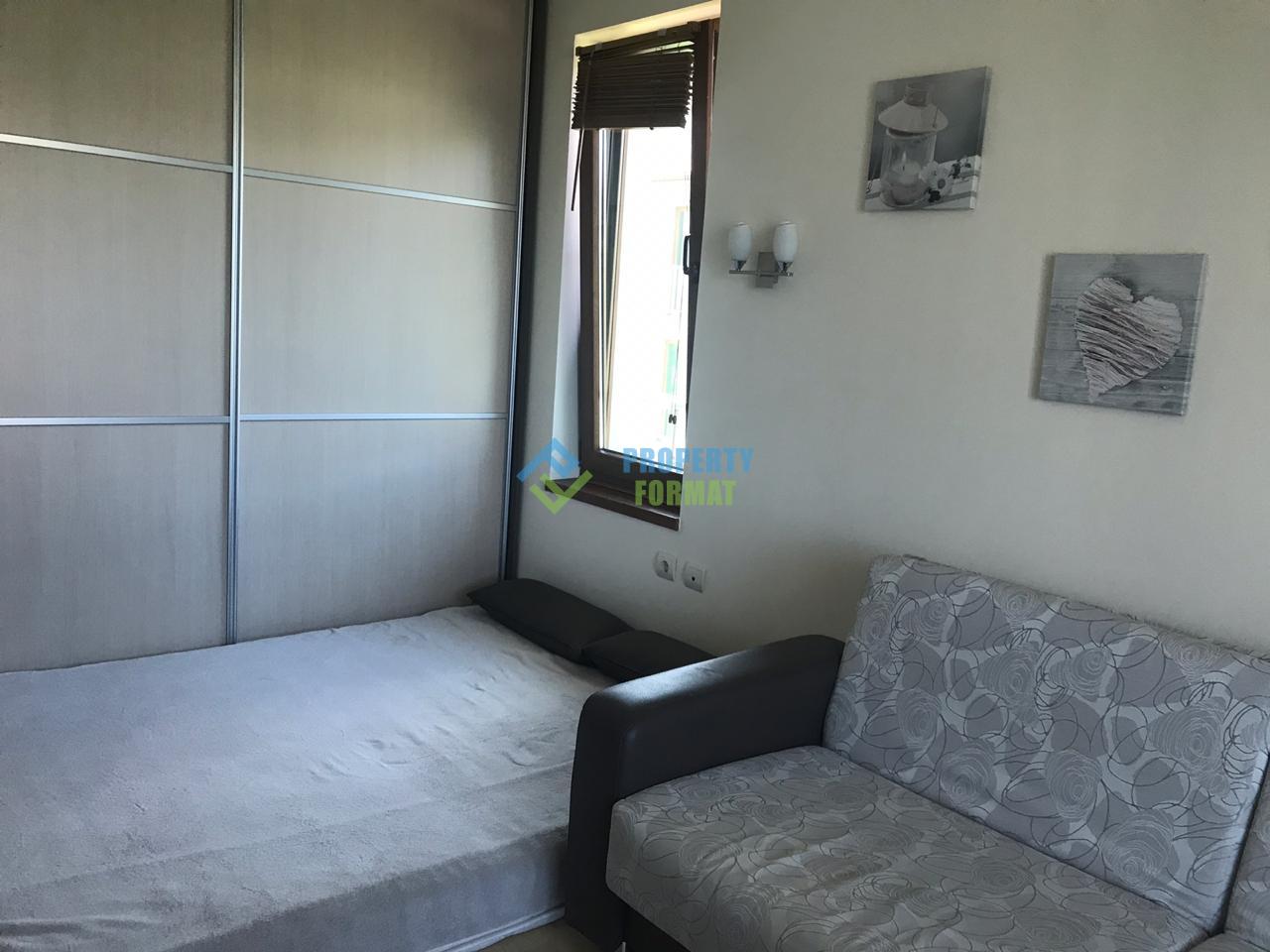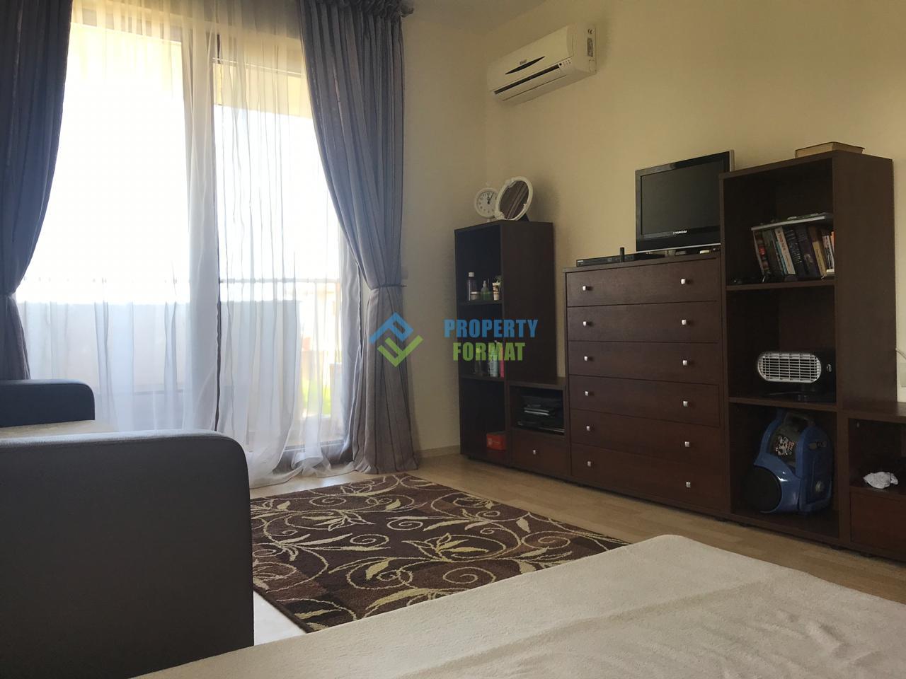 Уютная квартира с одной спальней полностью обставлена мебелью. Из бытовой техники в наличии электроплита, духовой шкаф, вытяжка, холодильник, телевизор, кондиционер. С террасы открывается замечательный вид на безграничные морские просторы и территорию комплекса.