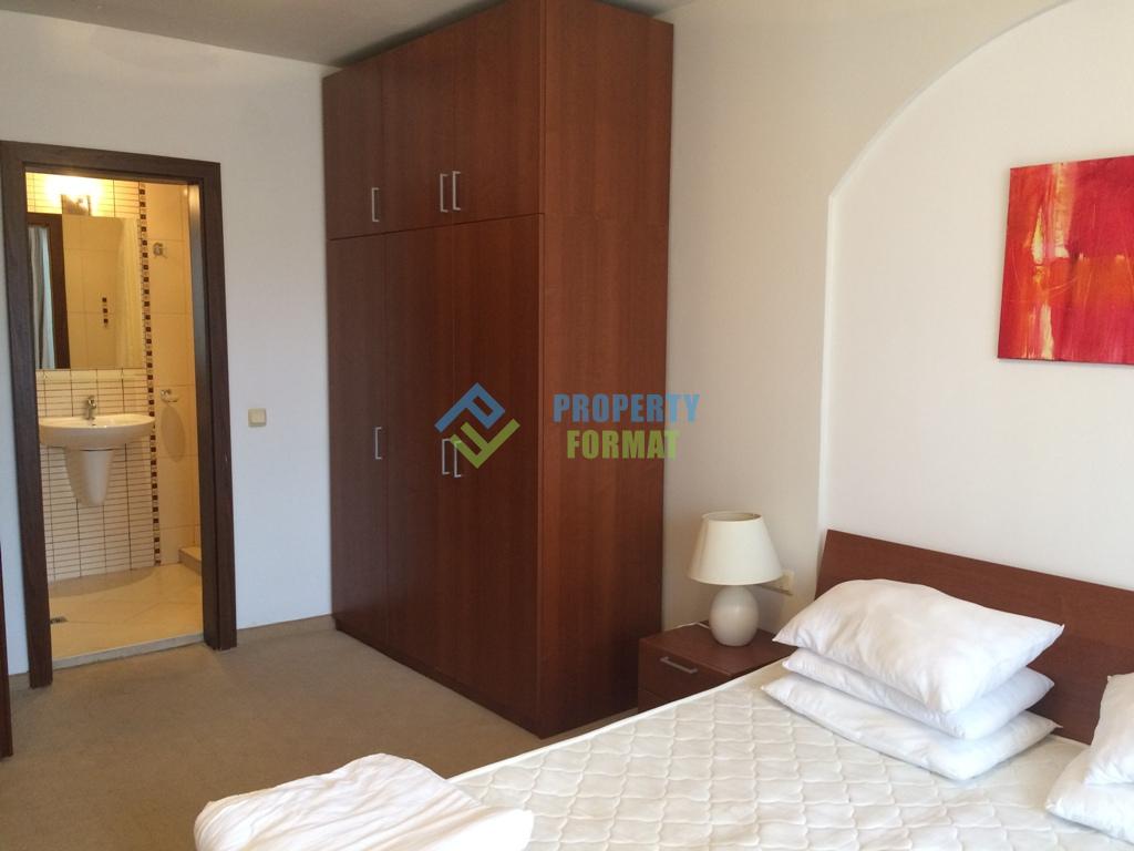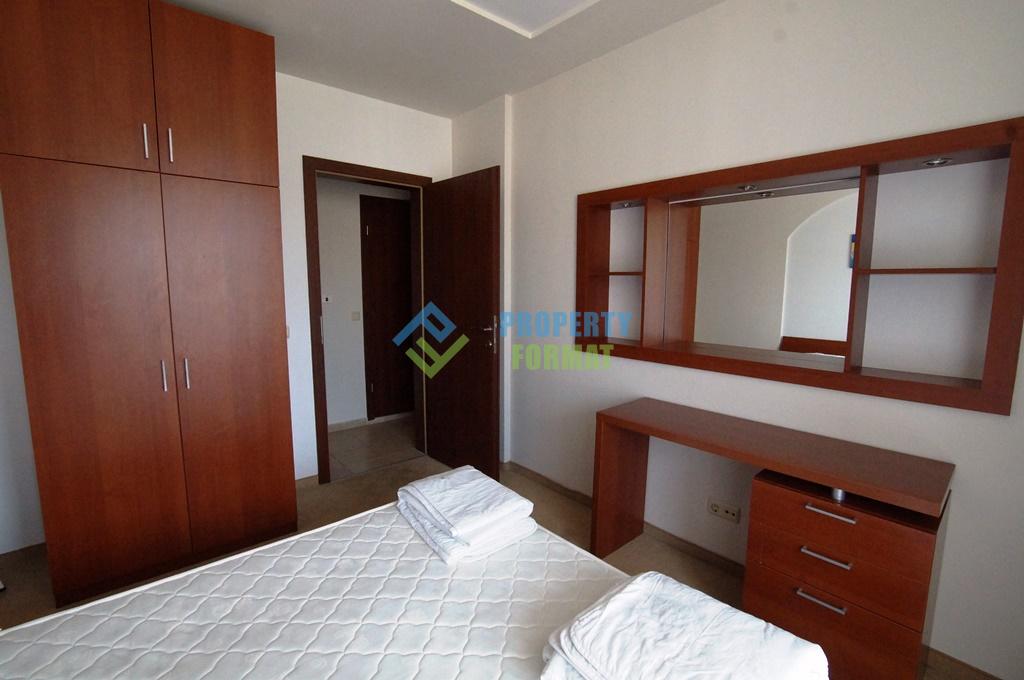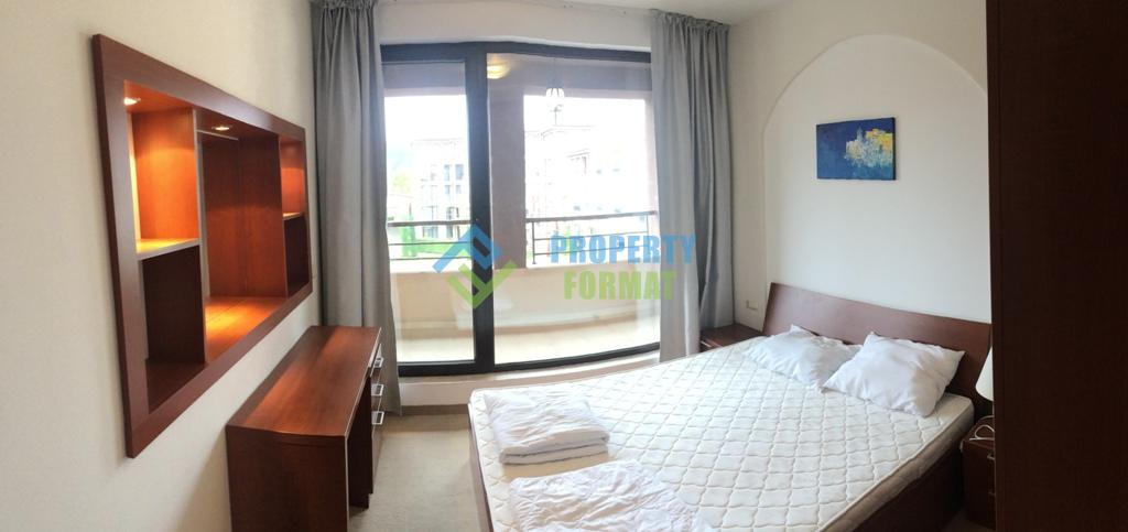 Квартира площадью почти 100 кв.м имеет следующее расположение: прихожая, санузел, гостиная с кухонным блоком, две спальни, одна из которых с санузлом, просторная терраса. В наличии вся мягкая мебель и бытовая техника для комфортного проживания. С балкона открывается вид на огромную территорию комплекса с бассейнами.