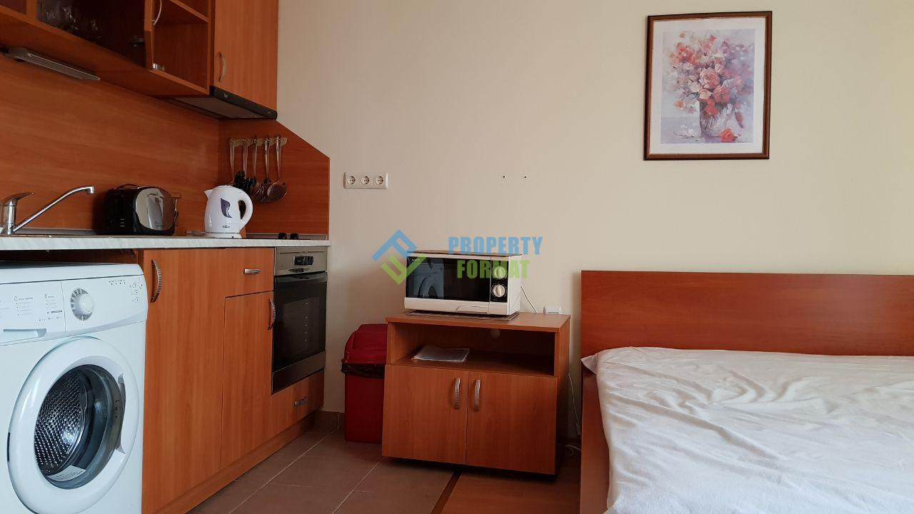 Предлагаемая на продажу студия уютная и светлая. Апартамент меблирован двумя односпальными кроватями и раскладным диваном, что уже как минимум четыре спальных места. Из бытовой техники в наличии электроплита с духовкой, вытяжка, стиральная машина, холодильник, электрочайник, утюг, кондиционер. Санузел оборудован привычной сантехникой. С террасы открывается вид на живописную территорию комплекса с бассейном.