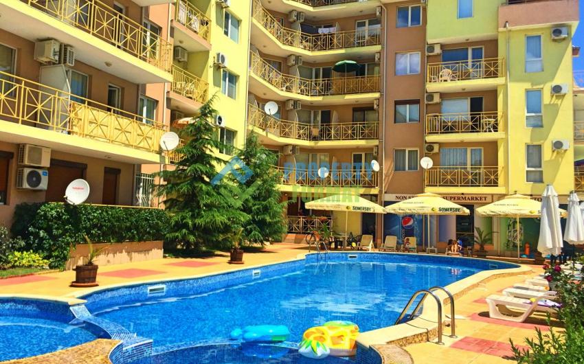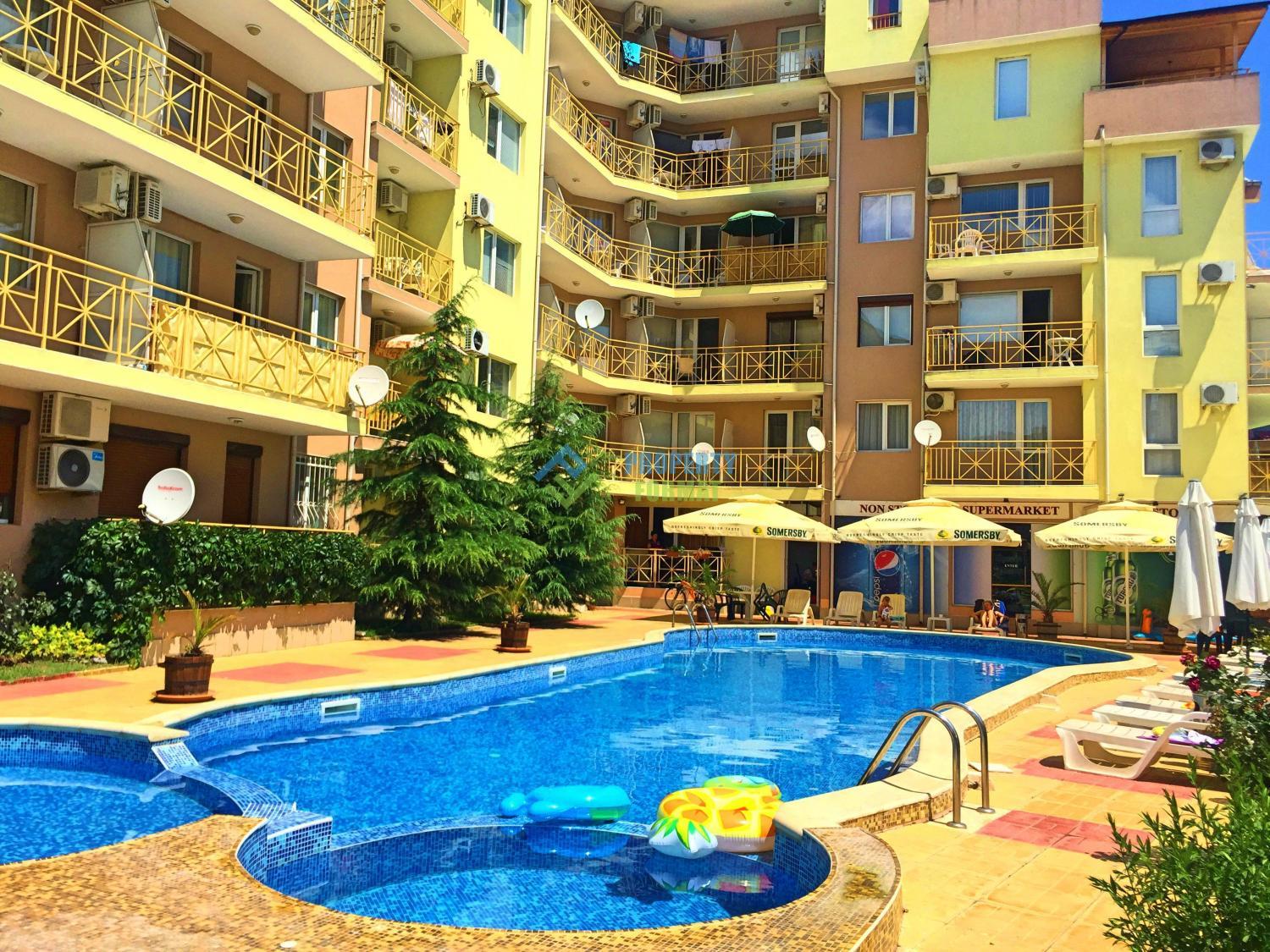 Продаваемый апартамент состоит из прихожей, гостиной с кухонной частью, спальни, ванной комнаты с туалетом, балкона с видом на бассейн. Квартира включает необходимую мебель, кондиционер и телевизор установлены в каждой комнате. Хорошая инвестиция для того, чтобы получать хорошую прибыль от сдачи жилья в аренду.