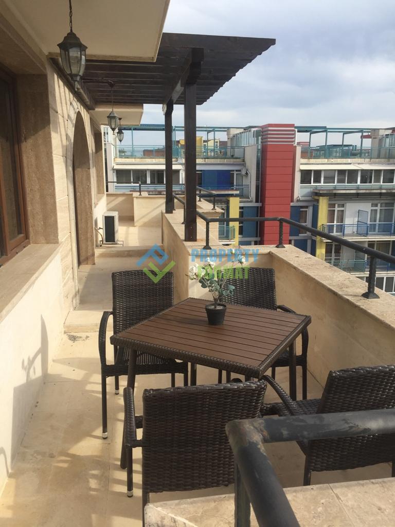 Из трех зданий комплекса А, В и С, предлагаемая на продажу квартира находится в третьем. Апартамент имеет спальню, гостиную с кухонной частью, оборудованного санузла и террасы. Для жизни есть вся нужная мебель и техника. Сидя на просторной террасе можно любоваться здешними видами за чашкой кофе или бокалом вина.