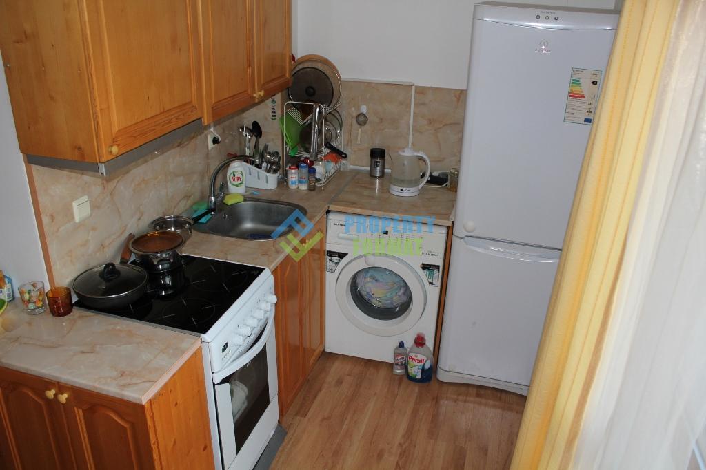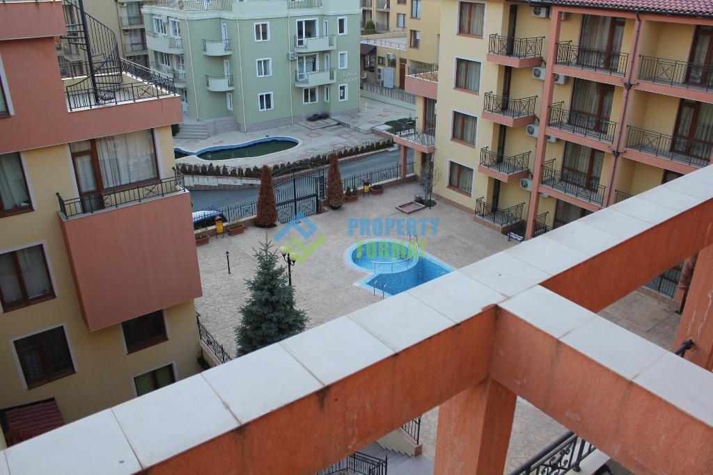 Cтудия уютно меблирована. В студии есть компактная кухня (встроенная кухонная плита с духовым шкафом, стиральная машина, холодильник, посуда), зона гостиной, санузел и балкон с видом на город, бассейны и немного море.
