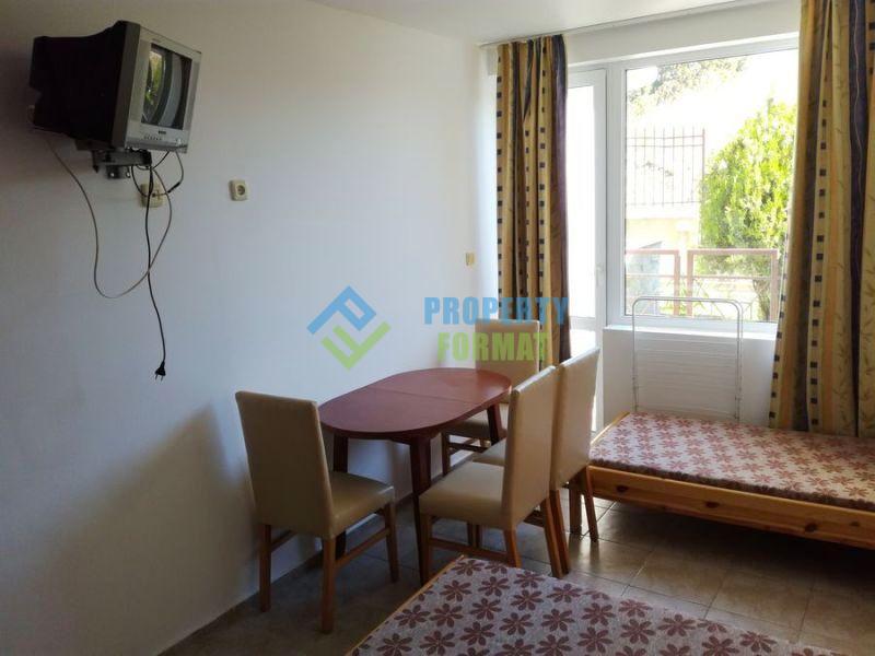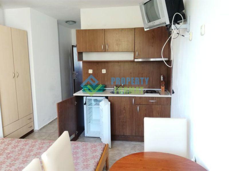 Продаваемая квартира имеет гостиную с двумя кроватями и кухонным уголком, санузел с ванной и туалетом, небольшую террасу с видом на зелень. Студия меблирована и с необходимой техникой.