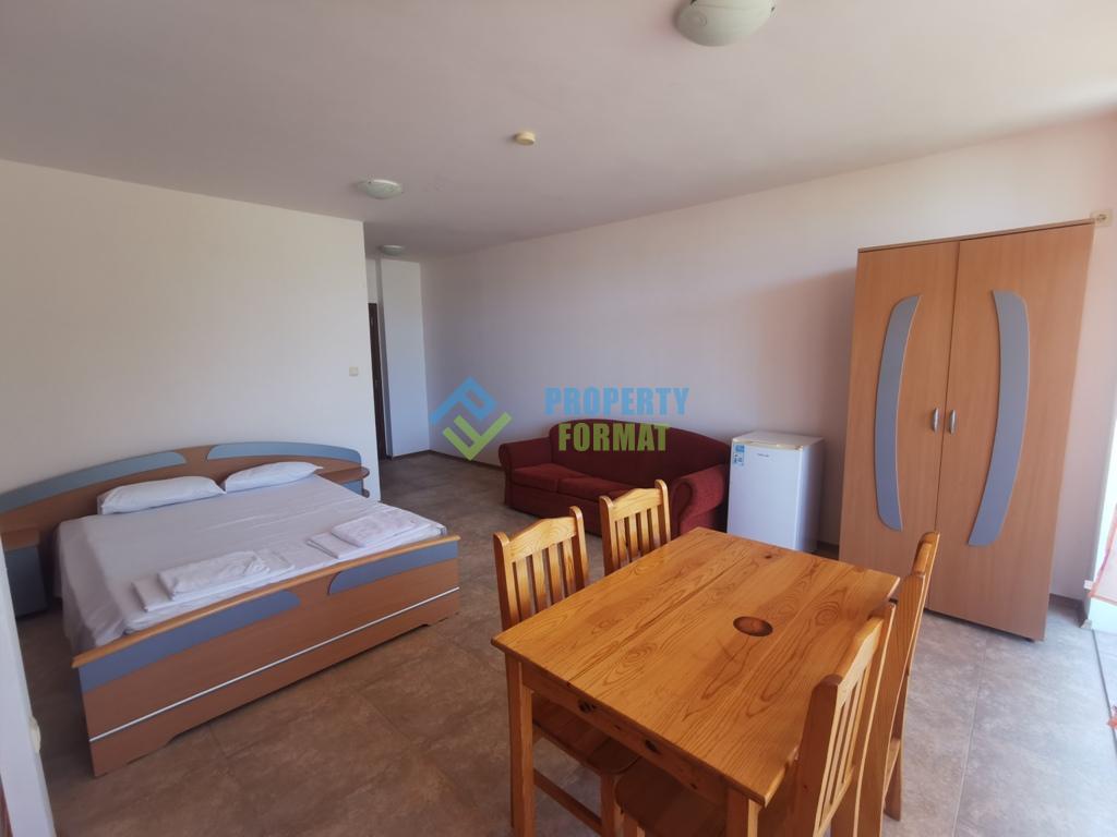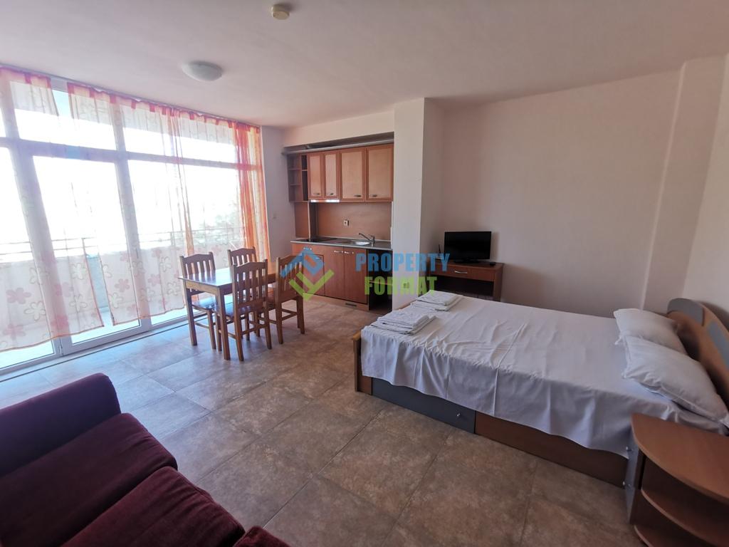 Предлагаем студию в комплексе Гранд Камелия. Меблированная и просторная, есть спальня, диван, шкаф для одежды, телевизор, обеденный стол и стулья. В нем есть мини-кухня, плита, вытяжка и холодильник. Есть ванная комната и терраса. Находится на втором жилом этаже, 43 кв.м., акт 16, обслуживание 8 евро/кв.м.