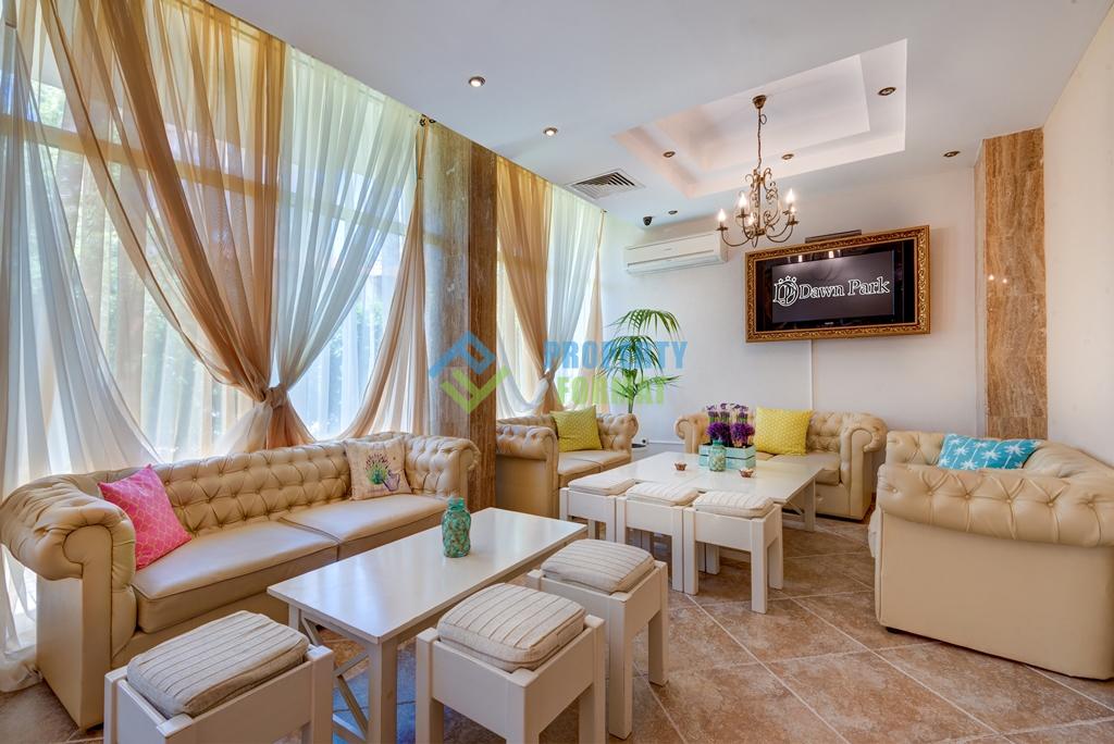 Комплекс Dawn Park состоит из двух отдельных зданий и насчитывает около 150 квартир. Комплекс предлагает: большой открытый бассейн для взрослых, джакузи, подводные массажные кровати, бар у бассейна, детский бассейн, детскую площадку, ресторан в средиземноморском стиле на 120 мест и просторную террасу с видом на бассейн, лобби-бар, магазин, массаж, круглосуточный рецепция в летний сезон, офис и парковка. В комплексе есть детский клуб, который предлагает развлечения для детей. Все владельцы могут бесплатно пользоваться бассейном для взрослых, детским бассейном, джакузи, подводными массажными салонами, баром на открытом воздухе, шезлонгами и зонтиками. Годовая плата за обслуживание - 13 евро/кв.м. Комплекс имеет разрешение на использование /Акт 16/.