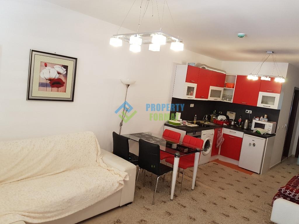 Продаваемая квартира площадью 72 кв.м состоит из прихожей, гостиной с кухонной зоной, отдельной спальни, совмещенного санузла и террасы. Апартамент имеет яркий интерьер, обставлен мебелью, оборудован встроенной техникой. На террасе можно отдыхать за столиком, любуясь видами на окрестности.